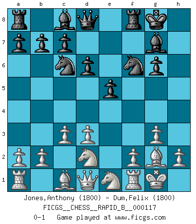 Last move : 0-1 2009 April 25 16:5:50 [Event "FICGS__CHESS__RAPID_B__000117"] [Site "FICGS"] [Date "2009.03.10"] [Round "1"] [White "Jones,Anthony"] [Black "Dum,Felix"] [Result "0-1"] [WhiteElo "1800"] [BlackElo "1800"] 1.Nf3 Nf6 2.g3 g6 3.Bg2 Bg7 4.O-O O-O 5.d3 d6 6.e4 e5 7.Nbd2 Nh5 8.Ne1 Nc6 9.c3 f5 10.exf5 Nf6 11.fxg6 hxg6 0-1 This chess game has been lost on time (started : 2009.03.10 18:35:10) Reti : King's Indian attack Kingside Castling by player White (move 4) Kingside Castling by player Black (move 4) Player Black won this chess game. Follow this game move after move (download)Fischer sacrificed virtually everything most of us weakies (to use his term) value, respect, and cherish, for the sake of an artful, often beautiful board game, for the ambivalent privilege of being its greatest master. (Paul Kollar) Wie gewinnt Tal? Er entwickelt alle seine Figuren in die Brettmitte und opfert sie dann irgendwo. (Robert James Fischer) No es suficiente ser un buen jugador, se debe también de jugar bién. (Siegbert Tarrasch) La vie est comme un jeu d'échecs : nous esquissons un plan, mais celui-ci est tributaire de ce que daignent faire l'adversaire aux échecs et le destin dans la vie. (Arthur Schopenhauer) The intuitive mind is a sacred gift; the rational mind is a faithful servant. We have created a society that honors the servant but has forgotten the gift. (Albert Einstein)