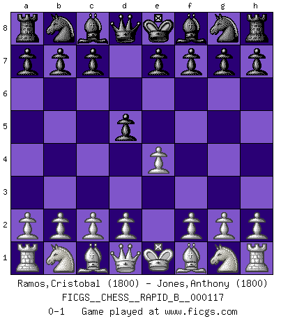 Last move : 0-1 2009 April 11 2:33:13 [Event "FICGS__CHESS__RAPID_B__000117"] [Site "FICGS"] [Date "2009.03.10"] [Round "1"] [White "Ramos,Cristobal"] [Black "Jones,Anthony"] [Result "0-1"] [WhiteElo "1800"] [BlackElo "1800"] 1.e4 d5 0-1 This chess game has been lost on time (started : 2009.03.10 18:35:10) Scandinavian (centre counter) defense Player Black won this chess game. Follow this game move after move (download)A passed Pawn increases in strength as the number of pieces on the board diminishes. (Capablanca) Jeder Schachmeister war einmal ein Anfänger. (Irving Chernev) Cuando la partida de Ajedrez termina, el Peón y el Rey regresan a la misma caja. (Irish saying) Aucun coup ne doit être joué sans but. (Pedro Damiano) Quotation,n.: The act of repeating erroneously the words of another. The words erroneously repeated. (Ambrose Bierce, The Devil's Dictionary)