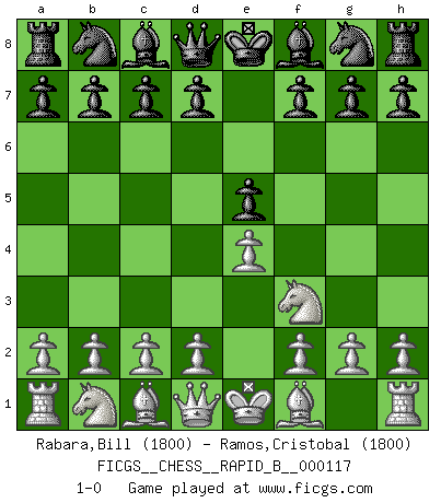 Last move : 1-0 2009 April 11 14:33:23 [Event "FICGS__CHESS__RAPID_B__000117"] [Site "FICGS"] [Date "2009.03.10"] [Round "1"] [White "Rabara,Bill"] [Black "Ramos,Cristobal"] [Result "1-0"] [WhiteElo "1800"] [BlackElo "1800"] 1.e4 e5 2.Nf3 1-0 This chess game has been lost on time (started : 2009.03.10 18:35:10) King's knight Opening Player White won this chess game. Follow this game move after move (download)Chess is a terrific way for kids to build self image and self esteem. (Saudin Robovic) Wir können eben der zündenden Macht des Opfers nicht wiederstehen, denn die Begeisterung für das Opfer liegt in der Natur des Menschen. (Rudolf Spielmann) El Ajedrez es un juego terrible. Si no dominas el centro, tu oponente tiene una posición mas libre. Si tu tienes el centro, entonces realmente tienes algo de que preocuparte. (Siegbert Tarrasch) Demandez au pauvre Cg1 ce qu'il en pense. Eduard Gufeld à propos de la variante Saemisch de l'Est-Indienne. Chess is as much a mystery as women. (Purdy)
