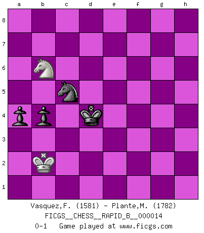 Last move : 0-1 2007 January 31 21:30:57 [Event "FICGS__CHESS__RAPID_B__000014"] [Site "FICGS"] [Date "2006.09.04"] [Round "1"] [White "Vasquez,Fernando"] [Black "Plante,Marc-Eric"] [Result "0-1"] [WhiteElo "1581"] [BlackElo "1782"] 1.e4 c5 2.d4 cxd4 3.c3 Nf6 4.e5 Nd5 5.Qxd4 e6 6.Nf3 Nc6 7.Qe4 d6 8.Nbd2 dxe5 9.Nxe5 Nxe5 10.Qxe5 Qd6 11.Qd4 Bd7 12.Ne4 Qb6 13.Qxb6 Nxb6 14.Be3 Bc6 15.f3 Be7 16.Bd4 O-O 17.O-O-O Nd5 18.c4 Nf4 19.Be3 Ng6 20.Be2 b6 21.Rhe1 Nh4 22.Bf1 Nf5 23.Bf4 Rfd8 24.Ng3 Nh4 25.Rxd8+ Rxd8 26.Rd1 Rc8 27.b3 g5 28.Be5 f6 29.Bc3 Kf7 30.Rd2 f5 31.Kb2 Rd8 32.Rxd8 Bxd8 33.Ne2 Bb7 34.h3 h5 35.Nc1 Bf6 36.Nd3 Bxc3+ 37.Kxc3 Kf6 38.b4 e5 39.c5 g4 40.f4 Bxg2 41.fxe5+ Ke7 42.Bxg2 Nxg2 43.hxg4 fxg4 44.c6 h4 45.Kd4 h3 46.Nf2 h2 47.Nh1 Ke6 48.Ke4 b5 49.Ng3 Ne1 50.c7 Kd7 51.Kf4 Nd3+ 52.Kxg4 Nxb4 53.Kh3 Nxa2 54.Kxh2 Kxc7 55.Ne4 Nb4 56.Kg3 a5 57.Kf4 Nd5+ 58.Kf3 Kc6 59.Ke2 Nf4+ 60.Ke3 Ne6 61.Nd6 b4 62.Kd3 Kd5 63.Kc2 a4 64.Kb2 Kxe5 65.Nc4+ Kd4 66.Nb6 Nc5 0-1 Sicilian : Smith-Morra gambit Kingside Castling by player Black (move 16) Queenside Castling by player White (move 17) 10 pieces endgame at move 52 : White KNPPP , Black KNPPP WHITE : King + 1 Knight 3 Pawns BLACK : King + 1 Knight 3 Pawns 9 pieces endgame at move 53 : White KNPP , Black KNPPP WHITE : King + 1 Knight 2 Pawns BLACK : King + 1 Knight 3 Pawns 8 pieces endgame at move 54 : White KNPP , Black KNPP WHITE : King + 1 Knight 2 Pawns BLACK : King + 1 Knight 2 Pawns 7 pieces endgame at move 54 : White KNP , Black KNPP WHITE : King + 1 Knight 1 Pawn BLACK : King + 1 Knight 2 Pawns 6 pieces endgame at move 64 : White KN , Black KNPP WHITE : King + 1 Knight BLACK : King + 1 Knight 2 Pawns Player Black won this chess game. Follow this game move after move (download)In Fischer's hands, a slight theoretical advantage is as good a being a Queen ahead. (Isaac Kashdan) Kasparov stellt für gewöhnlich die Regeln auf und bricht sie dann selbst wieder. (Alexej Shirov) Los errores estan ahí, esperando a que se cometan. (Savielly Tartakower) Dans le domaine de la peinture, de la gravure et de la sculpture, dès la première décennie de notre siècle, les artistes abandonnent la représentation de la partie d'échecs pour se concentrer sur les pièces, sur les échiquiers et sur toutes les variations auxquelles les unes et les autres peuvent donner lieu. On passe en quelque sorte d'un thème social à un thème musical (au sens de la musica médiévale, c'est-à-dire d'une notion qui inclue le rythme, l'harmonie, la construction et la déconstruction, etc.). Graphiquement et picturalement, l'échiquier apparaît comme une structure ouverte, dynamique, d'une richesse infinie, autorisant toutes les combinatoires et débouchant sur des mouvements et des rythmes de nature exponentielle. (Michel Pastoureau) There is a computer disease that anybody who works with computers knows about. It's a very serious disease and it interferes completely with the work. The trouble with computers is that you 'play' with them ! (Richard P. Feynman)