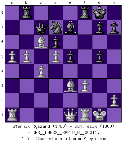 Last move : 1-0 2009 April 4 1:37:44 [Event "FICGS__CHESS__RAPID_B__000117"] [Site "FICGS"] [Date "2009.03.10"] [Round "1"] [White "Sternik,Ryszard"] [Black "Dum,Felix"] [Result "1-0"] [WhiteElo "1760"] [BlackElo "1800"] 1.e4 c5 2.Nf3 d6 3.d4 cxd4 4.Nxd4 Nf6 5.Nc3 a6 6.Be3 e5 7.Nb3 Be7 8.f3 Be6 9.Qd2 Nbd7 10.g4 b5 11.a4 b4 12.Nd5 Bxd5 13.exd5 a5 14.Bb5 O-O 15.Bc6 Rc8 16.O-O Nb6 17.Nxa5 Qc7 18.g5 Nfd7 19.Qxb4 Rb8 20.Qe1 f6 21.c4 fxg5 22.Bb5 Ra8 23.Nc6 Bf6 24.a5 Nc8 25.b4 Ne7 26.Nxe7+ Bxe7 27.Bc6 Rab8 28.b5 1-0 Sicilian : Najdorf, Byrne (English) attack Kingside Castling by player Black (move 14) Kingside Castling by player White (move 16) Player White won this chess game. Follow this game move after move (download)A Chess game is divided into three stages: the first, when you hope you have the advantage, the second when you believe you have an advantage, and the third... when you know you're going to lose ! (Savielly Tartakower) Konzentriere dich auf materielle Gewinne. Nimm, was dir dein Gegner gibt, ausser es gibt einen guten Grund der dagegenspricht. (Robert James Fischer) Estaba muy claro de que el punto vulnerable del Gran Maestro Americano (Bobby Fischer) radicaba en las posiciones de doble filo, colgantes, irracionales, donde el siempre falló en encontrar un triunfo aún en una posición de clara victoria. (Efim Geller) Pour se monter efficace, un Cavalier a besoin d'avant-postes ! Les Cavaliers font les meilleurs bloqueurs de pions passés. Lamb in skin of tiger, still fears the wolf. (Chinese proverb)
