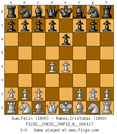 Last move : 1-0 2009 April 12 2:37:25 [Event "FICGS__CHESS__RAPID_B__000117"] [Site "FICGS"] [Date "2009.03.10"] [Round "1"] [White "Dum,Felix"] [Black "Ramos,Cristobal"] [Result "1-0"] [WhiteElo "1800"] [BlackElo "1800"] 1.e4 e6 2.d4 1-0 This chess game has been lost on time (started : 2009.03.10 18:35:10) French defense Player White won this chess game. Follow this game move after move (download)Chess problems demand from the composer the same virtues that characterize all worthwhile art: originality, invention, conciseness, harmony, complexity, and splendid insincerity. (Vladimir Nabokov) Ich habe Putins Aufstieg an die Macht beobachtet und seine Politik, die demokratischen Institutionen meines Landes zu zerstören. (Garry Kasparov) Los finales de Peón son del Ajedrez lo que el cesped es del Golf. (Cecil Purdy) Ne tendez aucun piège pour le plaisir ! Ne jouez rien dans l'espoir que l'adversaire réagisse de façon stupide ! Prenez toujours pour acquis que l'adversaire va trouver le meilleur coup ! Ne jouez jamais de coup dans l'espoir que l'adversaire ne voie pas la menace ! Chacun de vos coups doit améliorer la position d'une façon ou d'une autre. Unless I accept my faults I will most certainly doubt my virtues. (Hugh Prather)