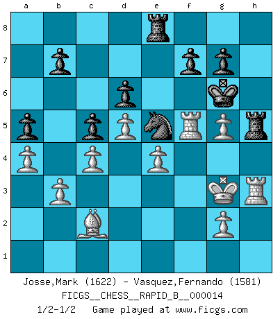 Last move : 1/2-1/2 2006 December 5 14:47:26 [Event "FICGS__CHESS__RAPID_B__000014"] [Site "FICGS"] [Date "2006.09.04"] [Round "1"] [White "Josse,Mark"] [Black "Vasquez,Fernando"] [Result "1/2-1/2"] [WhiteElo "1622"] [BlackElo "1581"] 1.e4 e5 2.Nf3 d6 3.Bc4 Be7 4.O-O Nf6 5.d3 O-O 6.Re1 Nc6 7.a4 Bg4 8.h3 Bxf3 9.Qxf3 Nd4 10.Qd1 c6 11.c3 Ne6 12.Bb3 Qc7 13.Qe2 Nc5 14.Bc2 Rfe8 15.f4 exf4 16.Bxf4 Ne6 17.Bc1 Nd7 18.d4 c5 19.Rd1 Rac8 20.d5 Nef8 21.Rf1 Ne5 22.Be3 Qd8 23.Qh5 h6 24.Nd2 Bg5 25.Bxg5 Qxg5 26.Qxg5 hxg5 27.Nf3 g4 28.Nxe5 Rxe5 29.hxg4 Nd7 30.Rf5 Re7 31.Raf1 Ne5 32.g5 Kh7 33.Kf2 Kg6 34.Rh1 R7e8 35.b3 Rh8 36.Rh3 a5 37.c4 Rh7 38.Kg3 Rh5 39.Kf4 Rch8 40.Kg3 Re8 1/2-1/2 Philidor's defense Kingside Castling by player White (move 4) Kingside Castling by player Black (move 5) This chess game ended in a draw. Follow this game move after move (download)Chess is in its essence a game, in its form an art, and in its execution a science. (Baron Tassilo) Die westlichen Werte sind eine Sprache, welche die Putin-Administration nicht versteht. (Garry Kasparov) Tu puedes aprender mucho mas de una partida que pierdas que de una partida ganada. Tendras que perder cientos de partidas antes de llegar a ser un buen jugador. (Jose Raul Capablanca) Les échecs sont plus proches de l'art de l'assassinat que de l'art de la guerre. (Arturo Perez-Reverte) A government big enough to give you everything you want is strong enough to take everything you have. (Thomas Jefferson)