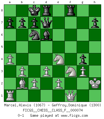 Last move : 0-1 2009 March 20 7:34:1 [Event "FICGS__CHESS__CLASS_F__000074"] [Site "FICGS"] [Date "2009.03.10"] [Round "1"] [White "Marcel,Alexis"] [Black "Geffroy,Dominique"] [Result "0-1"] [WhiteElo "1067"] [BlackElo "1300"] 1.f4 e5 2.fxe5 d6 3.exd6 Bxd6 4.Nf3 f6 5.g3 Nh6 6.Bg2 Nc6 7.b3 Be6 8.Bb2 Qd7 9.O-O O-O-O 10.a4 Bh3 11.d3 Rhf8 12.Nbd2 Bxg2 13.Kxg2 f5 14.Nh4 f4 15.Qe1 g5 16.Nhf3 fxg3 17.hxg3 Nf5 18.Ne4 Ne3+ 19.Kh2 Nxf1+ 20.Qxf1 g4 0-1 Bird : From gambit Kingside Castling by player White (move 9) Queenside Castling by player Black (move 9) Player Black won this chess game. Follow this game move after move (download)I'd rather have a Pawn than a finger. (Reuben Fine) Ich erzeugte keinen Neid, da mich die Schachspieler als Musiker und die Musiker als Schachspieler betrachteten. (Mark Taimanov) Me gusta decir que Bobby Fischer fue el mejor jugador que jamás haya existido. Pero lo que hizo de Fischer un genio, fue su habilidad de mezclar una frescura y pragmatismo Americano con ideas Rusas acerca de la estrategia. (Bruce Pandolfini) La vie est comme un jeu d'échecs : nous esquissons un plan, mais celui-ci est tributaire de ce que daignent faire l'adversaire aux échecs et le destin dans la vie. (Arthur Schopenhauer) A bird doesn't sing because it has an answer, it sings because it has a song. (Maya Angelou)