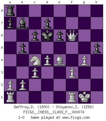 Last move : 1-0 2009 March 24 15:51:7 [Event "FICGS__CHESS__CLASS_F__000074"] [Site "FICGS"] [Date "2009.03.10"] [Round "1"] [White "Geffroy,Dominique"] [Black "Stoyanov,Zdravko"] [Result "1-0"] [WhiteElo "1300"] [BlackElo "1256"] 1.e4 e6 2.d4 c6 3.Bd3 Nf6 4.Bg5 Be7 5.Nf3 h6 6.Bh4 Ng4 7.Bxe7 Qxe7 8.Nbd2 b5 9.O-O O-O 10.e5 f5 11.h3 Nxe5 12.Nxe5 Qd6 13.Ndf3 Na6 14.c3 Nc7 15.Nh4 Nd5 16.Nhg6 Rf6 17.g4 fxg4 18.hxg4 Nf4 19.Nxf4 Rxf4 20.Bc2 Qd5 21.Qd3 Rf6 22.Qh7+ Kf8 23.Qh8+ Ke7 24.Qxg7+ Kd6 25.Qxf6 Bb7 26.f3 h5 27.Be4 Qc4 28.Nxc4+ 1-0 French defense Kingside Castling by player White (move 9) Kingside Castling by player Black (move 9) Player White won this chess game. Follow this game move after move (download)Chess is imagination. (David Bronstein) Ich rechne überhaupt nicht voraus. Ich gewinne auch so. (Robert James Fischer) Las ideas audaces son como las piezas del Ajedrez que avanzan hacia adelante. Ellas pueden ser vencidas, pero también pueden iniciar una partida victoriosa. (Goethe) Roi des jeux et jeu des rois, les échecs portent en eux un sentiment d'infini. Ils donnent à celui qui s'est efforcé d'en approfondir les arcanes l'impression de n'être pas à la mesure de l'homme; en fait, ils constituent un résumé de l'univers, un microcosme, et figurent cette grande échelle qui, dans les plans de la lumière descend jusqu'à la matière, qui des abîmes insondables remonte jusqu'en l'infini de Dieu. (Pyrame) There are three kinds of lies: lies, damned lies and statistics. (Mark Twain)