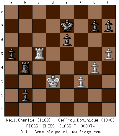 Last move : 0-1 2009 June 21 22:36:3 [Event "FICGS__CHESS__CLASS_F__000074"] [Site "FICGS"] [Date "2009.03.10"] [Round "1"] [White "Neil,Charlie"] [Black "Geffroy,Dominique"] [Result "0-1"] [WhiteElo "1160"] [BlackElo "1300"] 1.d4 d5 2.c4 e6 3.Nf3 Nf6 4.Bg5 Nbd7 5.Nc3 c6 6.cxd5 exd5 7.e4 dxe4 8.Qe2 Bb4 9.Ne5 Qa5 10.Bd2 Nxe5 11.dxe5 Qxe5 12.a3 Ba5 13.f3 e3 14.Qxe3 Qxe3+ 15.Bxe3 Nd5 16.Bd2 Nxc3 17.Bxc3 Bxc3+ 18.bxc3 O-O 19.Bc4 Re8+ 20.Kf2 Be6 21.Bxe6 Rxe6 22.Rhe1 Kf8 23.Rxe6 fxe6 24.Rb1 b6 25.Ke3 Rd8 26.a4 Ke7 27.Rb2 Rd1 28.Kf4 Rc1 29.a5 b5 30.h4 Rxc3 31.g4 a6 32.Rb4 c5 33.Re4 b4 34.h5 Ra3 35.Rc4 Rxa5 36.Ke5 b3 37.Rc1 Rb5 38.Ke4 Rb4+ 39.Kd3 a5 40.Rxc5 b2 0-1 QGD Kingside Castling by player Black (move 18) Player Black won this chess game. Follow this game move after move (download)Alekhine is a poet who creates a work of art out of something that would hardly inspire another man to send home a picture post card. (Max Euwe) Die Jungen erwarten, dass Opa einfach umfällt. Dann aber kann Opa fünf Stunden lang Schach spielen und die jungen Gegner an die Wand drücken. (Viktor Kortschnoi) Yo adoro todas la posiciones. Denme una partida posicional difícil, y la jugaré. Pero posiciones totalmente ganadas, no las tolero. (Hein Donner) Le jeu d'échecs est comme rejeté hors du temps. (Antoine de Saint-Exupéry) When you've done things right people won't know you've done anything at all. (Futurama)
