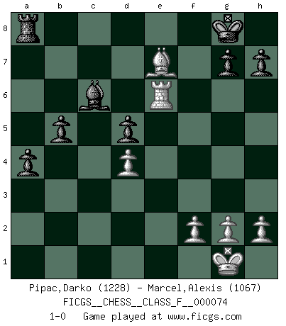 Last move : 1-0 2009 March 20 20:39:23 [Event "FICGS__CHESS__CLASS_F__000074"] [Site "FICGS"] [Date "2009.03.10"] [Round "1"] [White "Pipac,Darko"] [Black "Marcel,Alexis"] [Result "1-0"] [WhiteElo "1228"] [BlackElo "1067"] 1.e4 e5 2.Nf3 Nf6 3.d4 Nxe4 4.dxe5 d5 5.c4 c6 6.cxd5 cxd5 7.Nc3 Nxc3 8.bxc3 Bc5 9.Bg5 Qb6 10.Qd2 Be6 11.Nd4 Bxd4 12.Qxd4 Nd7 13.a4 Qxd4 14.cxd4 Rc8 15.Bb5 a6 16.Bxd7+ Bxd7 17.O-O Rc4 18.Rab1 Bc6 19.Be3 Rxa4 20.Ra1 Rxa1 21.Rxa1 O-O 22.Re1 a5 23.Bg5 a4 24.Be7 Ra8 25.Re3 b5 26.e6 fxe6 27.Rxe6 1-0 Petrov : Modern attack, Symmetrical variation Kingside Castling by player White (move 17) Kingside Castling by player Black (move 21) Player White won this chess game. Follow this game move after move (download)Not only will I predict his triumph over Botvinnik, but I'll go further and say that he'll probably be the greatest Chess player that ever lived. (John Collins) Es genügt nicht ein guter Spieler zu sein, man muß auch gut spielen. (Siegbert Tarrasch) Si yo gano un torneo, yo lo gano por mí mismo. Yo hago las jugadas. Nadie me ayuda. (Bobby Fischer) Que feriez-vous si vous étiez en train de jouer aux échecs et que la fin du monde arrive ? Je continuerais à jouer. (Saint Borromée) To steal ideas from one person is plagiarism. To steal from many is research. (Unknown)