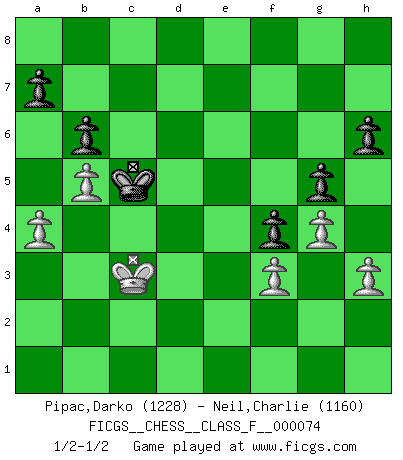 Last move : 1/2-1/2 2009 April 10 12:3:28 [Event "FICGS__CHESS__CLASS_F__000074"] [Site "FICGS"] [Date "2009.03.10"] [Round "1"] [White "Pipac,Darko"] [Black "Neil,Charlie"] [Result "1/2-1/2"] [WhiteElo "1228"] [BlackElo "1160"] 1.e4 e6 2.d4 d5 3.e5 c5 4.Bb5+ Bd7 5.Bxd7+ Nxd7 6.c3 Ne7 7.Bg5 h6 8.Bh4 g5 9.Bg3 Nc6 10.h3 cxd4 11.cxd4 Qa5+ 12.Qd2 Qxd2+ 13.Nxd2 Nxd4 14.Rc1 Bg7 15.Ngf3 Nc6 16.O-O Ncxe5 17.Bxe5 Nxe5 18.b3 Nc6 19.Rfe1 O-O 20.Rc2 Rac8 21.a3 Rfd8 22.b4 e5 23.b5 Na5 24.Rxc8 Rxc8 25.Nxe5 Re8 26.Nef3 Rxe1+ 27.Nxe1 Bc3 28.Nef3 Bxd2 29.Nxd2 b6 30.Kf1 Nc4 31.Nxc4 dxc4 32.Ke2 Kg7 33.Ke3 Kf6 34.Kd4 c3 35.Kxc3 Ke5 36.Kd3 Kd5 37.Kc3 Kc5 38.a4 f5 39.g4 f4 40.f3 Kd5 41.Kd3 Kc5 42.Kc3 Kd5 43.Kd3 Kc5 44.Kc3 1/2-1/2 French : Advance variation Kingside Castling by player White (move 16) Kingside Castling by player Black (move 19) This chess game ended in a draw. Follow this game move after move (download)Play the opening like a book, the middle game like a magician, and the endgame like a machine. (Spielmann) Schach ist ein schwarz-weisser Dschungel. (Garry Kasparov) Del Ajedrez se ha dicho que la vida no es lo suficientemente larga para él, pero eso es culpa de la vida, no del Ajedrez. (William Ewart Napier) Les ravages du H expliquent la différence de niveau entre Tal et Thal [Abergel]. A married woman is like a fish riding a bicycle. (Rodolfo d'Ettorre)