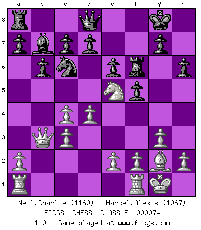 Last move : 1-0 2009 March 24 18:2:31 [Event "FICGS__CHESS__CLASS_F__000074"] [Site "FICGS"] [Date "2009.03.10"] [Round "1"] [White "Neil,Charlie"] [Black "Marcel,Alexis"] [Result "1-0"] [WhiteElo "1160"] [BlackElo "1067"] 1.c4 f5 2.d4 Nf6 3.Nc3 b6 4.Nf3 Bb7 5.g3 e6 6.Bg2 Bb4 7.O-O Bxc3 8.bxc3 O-O 9.Bg5 Nc6 10.Ne5 h6 11.Bxf6 Rxf6 12.Qb3 1-0 English : Anglo-Dutch defense Kingside Castling by player White (move 7) Kingside Castling by player Black (move 8) Player White won this chess game. Follow this game move after move (download)My God, Bobby Fischer plays so simply. (Alexei Suetin) Wenn ich mich einlogge, glauben die Leute gewöhnlich nicht, dass ich es selbst bin und sie fangen an, mir dumme Fragen zu stellen. Und wenn sie es glauben, stellen sie wieder andere dumme Fragen. (Judith Polgar) Fischer sacrificó virtualmente todo lo que la mayoría de nosotros los 'debiles' (término que él usa) valoramos, respetamos y apreciamos por el amor de un astuto, a menudo hermoso tablero de juego, por el privilegio ambivalente de ser su mas grande maestro. (Paul Kollar) Les Echecs représentent une sphère d'idées créatrices basée sur la volonté des deux protagonistes. (Smyslov) No man has ever achieved immortality in his own life time. (Unknown)