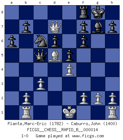 Last move : 1-0 2006 September 27 10:33:56 [Event "FICGS__CHESS__RAPID_B__000014"] [Site "FICGS"] [Date "2006.09.04"] [Round "1"] [White "Plante,Marc-Eric"] [Black "Caburro,John"] [Result "1-0"] [WhiteElo "1782"] [BlackElo "1400"] 1.e4 c5 2.Nf3 e6 3.d4 cxd4 4.Nxd4 Nc6 5.Nb5 d6 6.Bf4 e5 7.Be3 a6 8.N5c3 Nf6 9.Bg5 Be6 10.Bxf6 gxf6 11.Nd5 Bg7 12.Nbc3 O-O 13.Ne3 Qb6 14.Rb1 Bh6 15.Ned5 Bxd5 16.Nxd5 Qa5+ 17.c3 Qxa2 18.Nb6 Rad8 19.Bc4 Qa5 20.Nd7 Rxd7 21.Qg4+ Bg7 22.Qxd7 Qc5 23.Bd5 1-0 Sicilian, Szen (`anti-Taimanov') variation Kingside Castling by player Black (move 12) Player White won this chess game. Follow this game move after move (download)Chess is war over the board. The object is to crush the opponents mind. (Bobby Fischer) Mein Name ist Rustam Kamsky. Sie haben meinen Sohn belästigt. Bereiten Sie sich aufs Sterben vor. (Rustam Kamsky) Realmente no sabemos como el juego fue inventado, aunque hay sospechas. Tan pronto como descubramos a los culpables, se los haremos saber. (Bruce Pandolfini) Toute estimation doit être constamment réévaluée. (Jacob Estrin) Somehow our devils are never quite what we expect when we meet them face to face. (Nelson DeMille)