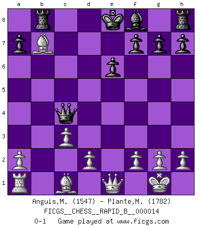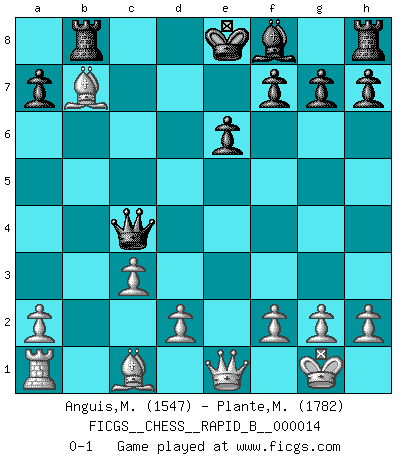 Last move : 0-1 2006 November 6 21:24:21 [Event "FICGS__CHESS__RAPID_B__000014"] [Site "FICGS"] [Date "2006.09.04"] [Round "1"] [White "Anguis,Miquel Angel"] [Black "Plante,Marc-Eric"] [Result "0-1"] [WhiteElo "1547"] [BlackElo "1782"] 1.e4 c5 2.c3 Nf6 3.e5 Nd5 4.Bc4 Nb6 5.Bb3 Nc6 6.Nf3 d5 7.exd6 Qxd6 8.O-O c4 9.Bc2 Bg4 10.Re1 Ne5 11.Rxe5 Bxf3 12.Qe1 Bd5 13.b3 e6 14.Na3 Qd7 15.Nxc4 Nxc4 16.Rxd5 Qxd5 17.Be4 Qb5 18.bxc4 Qxc4 19.Bxb7 Rb8 0-1 This chess game has been lost on time (started : 2006.09.04 21:16:24) Sicilian : Alapin's variation (2.c3) Kingside Castling by player White (move 8) Player Black won this chess game. Follow this game move after move (download)Your body has to be in top condition. Your Chess deteriorates as your body does. You can't separate body from mind. (Bobby Fischer) Offener Brief an US-Präsident Bush anlässlich der Verhaftung Bobby Fishers: Verhaften Sie mich. Stecken Sie mich in dieselbe Zelle wie Bobby Fisher und geben Sie uns ein Schachspiel mit. (Boris Vassilievich Spassky) Yo adoro todas la posiciones. Denme una partida posicional difícil, y la jugaré. Pero posiciones totalmente ganadas, no las tolero. (Hein Donner) Vous savez, camarade Pachman, je n'éprouve pas de plaisir à être ministre, je jouerais plutôt aux échecs comme vous, ou alors ferais une révolution au Venezuela. (Che Guevara à Ludek Pachman, 'Checkmate in Prague', 1975) Art is the triumph over chaos. (John Cheever)