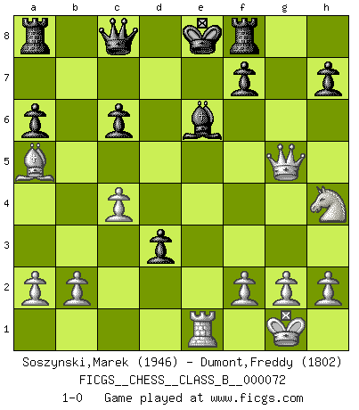 Last move : 1-0 2009 July 21 22:46:26 [Event "FICGS__CHESS__CLASS_B__000072"] [Site "FICGS"] [Date "2009.03.13"] [Round "1"] [White "Soszynski,Marek"] [Black "Dumont,Freddy"] [Result "1-0"] [WhiteElo "1946"] [BlackElo "1802"] 1.e4 c5 2.d4 cxd4 3.Qxd4 Nc6 4.Qe3 Nf6 5.Bd2 d5 6.exd5 Nxd5 7.Qb3 Bf5 8.Nf3 Qd7 9.Bb5 a6 10.Bxc6 bxc6 11.O-O Qc7 12.c4 Nf6 13.Qa4 Nd7 14.Ba5 Qb7 15.Nbd2 Nc5 16.Qa3 Nd3 17.Nh4 e5 18.Qc3 Qc8 19.Rad1 Be7 20.Ndf3 e4 21.Qxg7 Rf8 22.Ng5 Bxg5 23.Qxg5 Be6 24.Rxd3 exd3 25.Re1 1-0 This chess game has been lost on time (started : 2009.03.13 6:44:16) Sicilian : Smith-Morra gambit Kingside Castling by player White (move 11) Player White won this chess game. Follow this game move after move (download)I know people who have all the will in the world, but still can't play good Chess. (Bobby Fischer) Ich bin der einzige Schachspieler, der sich während der Vorbereitungen zum Turnier verletzt hat. (Woody Allen) Nada excita más a Grandes Maestros aburridos que una novedad teórica. (Dominic Lawson) Le succès, c'est être capable d'aller d'échec en échec sans perdre son enthousiasme. (Winston Churchill) Tomorrow's what you make of it. (Horatio Caine, C.S.I. Miami)