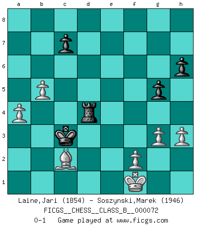 Last move : 0-1 2009 July 20 8:24:46 [Event "FICGS__CHESS__CLASS_B__000072"] [Site "FICGS"] [Date "2009.03.13"] [Round "1"] [White "Laine,Jari"] [Black "Soszynski,Marek"] [Result "0-1"] [WhiteElo "1854"] [BlackElo "1946"] 1.e4 e5 2.Nf3 Nc6 3.d4 exd4 4.Nxd4 Nf6 5.Nxc6 bxc6 6.e5 Qe7 7.Qe2 Nd5 8.c4 Ba6 9.b3 O-O-O 10.g3 g5 11.Bg2 Bg7 12.Bb2 Rde8 13.O-O Bxe5 14.Qd2 Bxb2 15.Qxb2 Qf6 16.Qa3 Bb7 17.cxd5 Qxa1 18.dxc6 dxc6 19.Qxa7 f5 20.Nd2 Re1 21.Nc4 Rxf1+ 22.Bxf1 c5 23.Qxc5 Qf6 24.b4 Qc6 25.Qxc6 Bxc6 26.Ne5 Kb7 27.Nxc6 Kxc6 28.a4 Rb8 29.b5+ Kc5 30.Bd3 h6 31.Bxf5 Rd8 32.h3 Rd4 33.Bc2 Kb4 34.Kf1 Kc3 0-1 Scotch : Mieses variation Queenside Castling by player Black (move 9) Kingside Castling by player White (move 13) Player Black won this chess game. Follow this game move after move (download)What is the object of playing a gambit opening?... To acquire a reputation of being a dashing player at the cost of losing a game. (Siegbert Tarrasch) Über die Verhaftung Bobby Fischers: Warum es die Bush-Administration für nötig befindet einen 61 Jahre alten Mann zu hetzten, der für niemanden ausser sich selbste eine Gefahr darstellt ist ein Rätsel. (Nigel Short) Un Peón pasado aumenta su poder a medida de que el número de piezas en el tablero disminuye. (Capablanca) Les pièces de l'échiquier étaient impitoyables. Elles le retenaient, elles l'absorbaient. Il y avait de l'horreur en cela, mais aussi une harmonie unique. Car, qu'y a-t-il dans le monde, à part les échecs ? (V. Nabokov) When you stop learning you start dying. (Scott Adams)