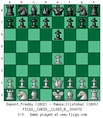 Last move : 1-0 2009 April 24 15:58:35 [Event "FICGS__CHESS__CLASS_B__000072"] [Site "FICGS"] [Date "2009.03.13"] [Round "1"] [White "Dumont,Freddy"] [Black "Ramos,Cristobal"] [Result "1-0"] [WhiteElo "1802"] [BlackElo "1800"] 1.e4 e6 2.Qe2 1-0 This chess game has been lost on time (started : 2009.03.13 6:44:16) French : Chigorin variation Player White won this chess game. Follow this game move after move (download)For surely of all the drugs in the world, Chess must be the most permanently pleasurable. (Assiac) Bogoljubow: Matt in vier Zügen! Tartakower: Ich verbitte mir jede Belästigung! (Savielly Grigorievitsch Tartakower) El Ajedrez es tortura mental. (Garry Kasparov) On peut tirer plus d'utilité d'une partie perdue que de 100 parties gagnées. (Capablanca) Humor is by far the most significant activity of the human brain. (Edward De Bono)