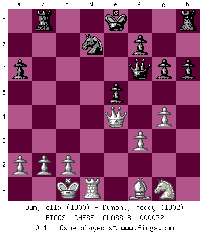 Last move : 0-1 2009 August 13 20:14:18 [Event "FICGS__CHESS__CLASS_B__000072"] [Site "FICGS"] [Date "2009.03.13"] [Round "1"] [White "Dum,Felix"] [Black "Dumont,Freddy"] [Result "0-1"] [WhiteElo "1800"] [BlackElo "1802"] 1.e4 c5 2.Nf3 d6 3.d4 cxd4 4.Nxd4 Nf6 5.Nc3 e6 6.Be3 a6 7.Qd2 b5 8.f3 Nbd7 9.O-O-O Bb7 10.g4 h6 11.h4 b4 12.Nce2 d5 13.exd5 Nxd5 14.Rg1 e5 15.Nf5 g6 16.Nfg3 Nxe3 17.Qxe3 Bc5 18.Qb3 Bxg1 19.Nxg1 Qxh4 20.Qxb4 Rb8 21.Ne4 Bxe4 22.Qxe4 Qf6 0-1 This chess game has been lost on time (started : 2009.03.13 6:44:16) Sicilian : Scheveningen, English variation Queenside Castling by player White (move 9) Player Black won this chess game. Follow this game move after move (download)He who fears an isolated Queen's Pawn should give up Chess. (Siegbert Tarrasch) Wie, soll nun auch die Opposition abgeschafft werden? Ja, es tut mir leid, Ihnen diesen Schmerz nicht ersparen zu können. (Aaron Nimzowitsch) La vida es como el Ajedrez, con lucha, competición y eventos buenos y malos. (Benjamin Franklin) Vous m'avez demandé de vous exposer quel est le fondement de la prière. Je ne fais que préparer les pièces du jeu sur la table... Nous sera-t-il permis d'en adopter les règles et si nous les appliquons scrupuleusement nous ne tarderons pas à faire mat le Roi divin ! Il ne pourra échapper à nos mains. (Sainte Thérèse d'Avila, Chemin de perfection) It's only after you lost everything, Tyler says, that you're free to do anything. (Chuck Palahniuk, Fight Club)