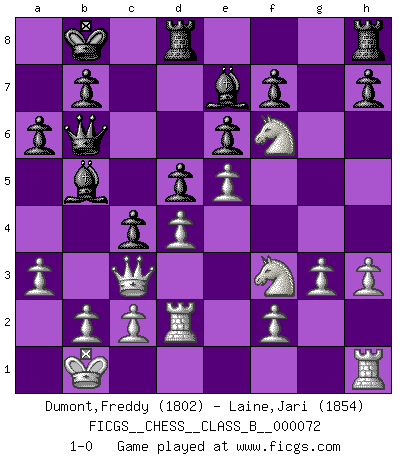 Last move : 1-0 2009 July 20 8:23:43 [Event "FICGS__CHESS__CLASS_B__000072"] [Site "FICGS"] [Date "2009.03.13"] [Round "1"] [White "Dumont,Freddy"] [Black "Laine,Jari"] [Result "1-0"] [WhiteElo "1802"] [BlackElo "1854"] 1.e4 Nc6 2.Nf3 Nf6 3.e5 Ng4 4.d4 d6 5.h3 Nh6 6.Nc3 a6 7.Bxh6 gxh6 8.Bd3 Nb4 9.a3 Nxd3+ 10.Qxd3 d5 11.O-O-O c6 12.Ne2 h5 13.Kb1 Qb6 14.Nh4 e6 15.Nf4 Be7 16.g3 Bd7 17.Nxh5 O-O-O 18.Nf3 Kb8 19.Rd2 c5 20.Nf6 Bb5 21.Qb3 c4 22.Qc3 1-0 KP : Nimzovich defense Queenside Castling by player White (move 11) Queenside Castling by player Black (move 17) Player White won this chess game. Follow this game move after move (download)Chess, like love, like music, has the power to make people happy. (Siegbert Tarrasch) Man braucht nicht immer den besten Zug zu spielen: Ein Zug muß aktiv, unternehmungslustig, korrekt und schön sein. (David Bronstein) Una partida de Ajedrez se divide en 3 etapas: la primera cuando piensas que tienes la ventaja, la segunda cuando crees que tienes la ventaja y la tercera... ¡cuando te das cuenta que vas a perder!. (Savielly Tartakower) Toutes les manuvres exécutées sur une colonne ouverte ont pour but ultime l'intrusion définitive sur la septième ou la huitième rangée, en plein cur de la position ennemie. (Aaron Nimzovitch) You can only get smarter by playing a smarter opponent. (Revolver, movie)