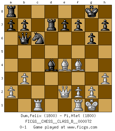 Last move : 0-1 2009 July 17 23:3:24 [Event "FICGS__CHESS__CLASS_B__000072"] [Site "FICGS"] [Date "2009.03.13"] [Round "1"] [White "Dum,Felix"] [Black "Pi,Htet"] [Result "0-1"] [WhiteElo "1800"] [BlackElo "1800"] 1.e4 c6 2.d4 d5 3.exd5 cxd5 4.c4 Nf6 5.Nf3 g6 6.Nc3 Bg7 7.Be2 O-O 8.Bf4 Nc6 9.c5 Ne4 10.O-O Bg4 11.h3 Bxf3 12.Bxf3 Bxd4 13.Nxe4 dxe4 14.Bxe4 Bxc5 15.Rc1 Qb6 16.Qc2 Bd4 17.Qe2 Rfd8 18.b3 Rd7 0-1 This chess game has been lost on time (started : 2009.03.13 6:44:16) Caro-Kann : Panov-Botvinnik attack Kingside Castling by player Black (move 7) Kingside Castling by player White (move 10) Player Black won this chess game. Follow this game move after move (download)Becoming successful at Chess allows you to discover your own personality. That's what I want for the kids I teach. (Saudin Robovic) Ein Isolani verdüstert die Stimmung auf dem ganzen Schachbrett. (Savielly Grigorievitsch Tartakower) Preferería tener un Peón que un dedo. (Reuben Fine) Même si l'adversaire joue le coup analysé précédemment, recommencez l'analyse en voyant la nouvelle position. Première règle de Blumenfeld A good aphorism is too hard for the tooth of time, and is not worn away with the centuries, although it serves as food for every speech. (Friedrich Nietzsche)