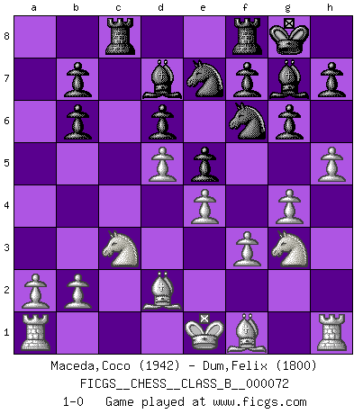Last move : 1-0 2009 June 22 4:26:29 [Event "FICGS__CHESS__CLASS_B__000072"] [Site "FICGS"] [Date "2009.03.13"] [Round "1"] [White "Maceda,Coco"] [Black "Dum,Felix"] [Result "1-0"] [WhiteElo "1942"] [BlackElo "1800"] 1.d4 Nf6 2.c4 g6 3.Nc3 Bg7 4.e4 d6 5.f3 O-O 6.Be3 Nc6 7.Nge2 e5 8.d5 Ne7 9.g4 c6 10.Ng3 cxd5 11.cxd5 Bd7 12.h4 Rc8 13.Qb3 Qa5 14.Bd2 Qb6 15.Qxb6 axb6 16.h5 1-0 This chess game has been lost on time (started : 2009.03.13 6:44:16) King's Indian : Saemisch, 6...Nc6 Kingside Castling by player Black (move 5) Player White won this chess game. Follow this game move after move (download)Chess, like love, is infectious at any age. (Flohr) Den Ruhm habe ich schon, jetzt brauche ich noch das Geld. (Wilhelm Steinitz) Bobby Fischer es el jugador de Ajedrez mas grande que jamás haya existido. (Ken Smith) On croit qu'il y a plus de mauvais joueurs que de bons joueurs, c'est faux : Il y a autant de joueurs qui gagnent que de joueurs qui perdent. (Philippe Geluck) For to win one hundred victories in one hundred battles is not the acme of skill. To subdue the enemy without fighting is the acme of skill. (Sun Tzu)