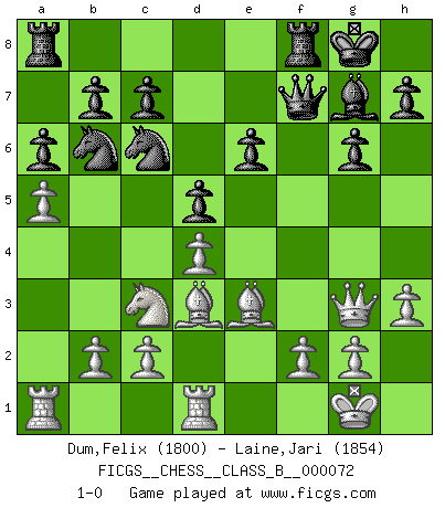 Last move : 1-0 2009 July 20 8:24:1 [Event "FICGS__CHESS__CLASS_B__000072"] [Site "FICGS"] [Date "2009.03.13"] [Round "1"] [White "Dum,Felix"] [Black "Laine,Jari"] [Result "1-0"] [WhiteElo "1800"] [BlackElo "1854"] 1.e4 Nc6 2.Nf3 Nf6 3.Nc3 d5 4.e5 Nd7 5.d4 Nb6 6.Bd3 Bg4 7.Be3 e6 8.a3 g6 9.O-O Bg7 10.h3 Bxf3 11.Qxf3 f6 12.exf6 Qxf6 13.Qg3 Qf7 14.a4 a6 15.Rfd1 O-O 16.a5 1-0 KP : Nimzovich defense Kingside Castling by player White (move 9) Kingside Castling by player Black (move 15) Player White won this chess game. Follow this game move after move (download)When I asked Fischer why he had not played a certain move in our game, he replied: 'Well, you laughed when I wrote it down !' (Mikhail Tal) Ich liebe den Moment, wenn ich das Ego meines Gegenüber breche. (Robert James Fischer) El Ajedrez es una guerra en un tablero. El objetivo es aplastar la mente del oponente. (Bobby Fischer) A chaque perte on perd un peu de soi. (Joël Lautier) Methinks King Thibault should dub Marius Zubac a knight of the square board... I mean table, henceforth addressing him as Sir Marius, and bestow on him a suitable land from the kingdom of FICGS & marry him off to a worthy, fair maiden, lest he slice our heads with his mighty sword in his wrath. (Dinesh De Silva)