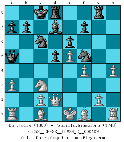 Last move : 0-1 2009 July 8 10:6:56 [Event "FICGS__CHESS__CLASS_C__000109"] [Site "FICGS"] [Date "2009.03.13"] [Round "1"] [White "Dum,Felix"] [Black "Paolillo,Giampiero"] [Result "0-1"] [WhiteElo "1800"] [BlackElo "1748"] 1.e4 e6 2.d4 d5 3.Nc3 Bb4 4.e5 c5 5.a3 Bxc3+ 6.bxc3 Qc7 7.Qg4 Ne7 8.Qxg7 Rg8 9.Qxh7 cxd4 10.Ne2 Nbc6 11.f4 Bd7 12.h4 dxc3 13.Qd3 O-O-O 14.Nxc3 Qa5 15.Qd2 Nf5 0-1 This chess game has been lost on time (started : 2009.03.13 20:27:19) French : Winawer, Classical variation Queenside Castling by player Black (move 13) Player Black won this chess game. Follow this game move after move (download)Dazzling combinations are for the many, shifting wood is for the few. (Georg Kieninger) Im Blitz ist es einfacher mit einer Figur weniger anzugreifen, als sich mit einer Mehrfigur zu verteidigen. (Mikhail Nekhemyevich Tal) El Ajedrez, como cualquier otra actividad creativa, puede existir solo a través de méritos combinados de aquellos que tienen talento creativo y de aquellos que tienen la habilidad de organizar un trabajo creativo. (Mikhail Botvinnik) Horreur, mais aussi harmonie suprême : qu'y avait-il en effet au monde en dehors des échecs ? Le brouillard, l'inconnu, le non-être... (Vladimir Nabokov) There's no money in correspondence chess. (John Knudsen)