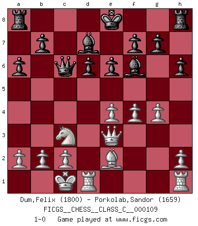 Last move : 1-0 2009 August 24 21:23:12 [Event "FICGS__CHESS__CLASS_C__000109"] [Site "FICGS"] [Date "2009.03.13"] [Round "1"] [White "Dum,Felix"] [Black "Porkolab,Sandor"] [Result "1-0"] [WhiteElo "1800"] [BlackElo "1659"] 1.e4 c5 2.Nf3 d6 3.d4 cxd4 4.Nxd4 Nf6 5.Nc3 a6 6.Bg5 e6 7.f4 Be7 8.Qf3 Qc7 9.g4 h6 10.Bxf6 Bxf6 11.O-O-O Nc6 12.Nxc6 Qxc6 13.Be2 Bd7 14.Qe3 1-0 Sicilian : Najdorf, 7...Be7 Queenside Castling by player White (move 11) Player White won this chess game. Follow this game move after move (download)The game of chess is the touchstone of the intellect. (Goethe) Das Schach ist nichts für kleine Geister, es beansprucht einen vollen Mann, der sich nicht sklavisch an das Überlieferte hält, sondern selbständig die Tiefen des Spiels zu ergründen sucht. (Wilhelm Steinitz) La batalla por la última verdad nunca sera ganada. Y es por eso que el Ajedrez es tan fascinante. (Hans Kmoch) Tous ces prétendus hommes politiques sont les pions, les Cavaliers, les Tours ou les Fous d'une partie d'échecs qui se jouera tant qu'un hasard ne renversera pas l'échiquier. (Honoré de Balzac) No enterprise is more likely to succeed than one concealed from the enemy until it is ripe for execution. (Niccolo Machiavelli)
