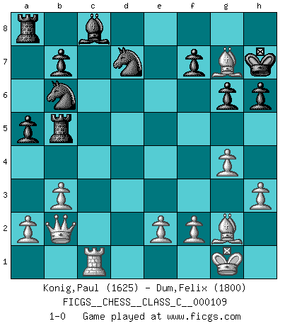 Last move : 1-0 2009 August 26 21:31:27 [Event "FICGS__CHESS__CLASS_C__000109"] [Site "FICGS"] [Date "2009.03.13"] [Round "1"] [White "Konig,Paul"] [Black "Dum,Felix"] [Result "1-0"] [WhiteElo "1625"] [BlackElo "1800"] 1.c4 Nf6 2.Nf3 g6 3.g3 Bg7 4.d4 O-O 5.Bg2 d6 6.Nc3 c6 7.O-O Ne8 8.Bg5 h6 9.Be3 Nd7 10.Qd2 Kh7 11.b3 Nef6 12.h3 Qa5 13.Qb2 Qc7 14.Rac1 Nb6 15.Bf4 Re8 16.g4 e5 17.dxe5 dxe5 18.Bg3 a5 19.Nxe5 Rxe5 20.Nb5 cxb5 21.cxb5 Qxc1 22.Rxc1 Rxb5 23.Be5 Nfd7 24.Bxg7 1-0 This chess game has been lost on time (started : 2009.03.13 20:27:19) English Opening Kingside Castling by player Black (move 4) Kingside Castling by player White (move 7) Player White won this chess game. Follow this game move after move (download)Fischer prefers to enter Chess history alone. (Miguel Najdorf) Sicherlich können nur Meister einen Stil haben. Daß ein nicht-Meister auch nur ein einziges Mal in seinem Leben eine Partie folgerecht durchführte, habe ich niemals bemerkt. (Emanuel Lasker) Ciertamente, de todas la drogas del mundo, el Ajedrez debe ser el mas placentero permamentemente. (Assiac) Roi des jeux et jeu des rois, les échecs portent en eux un sentiment d'infini. Ils donnent à celui qui s'est efforcé d'en approfondir les arcanes l'impression de n'être pas à la mesure de l'homme; en fait, ils constituent un résumé de l'univers, un microcosme, et figurent cette grande échelle qui, dans les plans de la lumière descend jusqu'à la matière, qui des abîmes insondables remonte jusqu'en l'infini de Dieu. (Pyrame) Have no fear of perfection - you'll never reach it. (Salvador Dali)