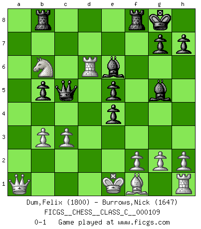 Last move : 0-1 2009 March 28 23:30:13 [Event "FICGS__CHESS__CLASS_C__000109"] [Site "FICGS"] [Date "2009.03.13"] [Round "1"] [White "Dum,Felix"] [Black "Burrows,Nick"] [Result "0-1"] [WhiteElo "1800"] [BlackElo "1647"] 1.e4 c5 2.Nf3 Nc6 3.d4 cxd4 4.Nxd4 Nf6 5.Nc3 e5 6.Ndb5 d6 7.Bg5 a6 8.Na3 b5 9.Nd5 Be7 10.Bxf6 Bxf6 11.c3 Bg5 12.Nc2 Rb8 13.b3 Ne7 14.Nce3 O-O 15.a4 Be6 16.axb5 axb5 17.Ra6 Nxd5 18.Nxd5 Qc8 19.Qa1 f5 20.Rxd6 fxe4 21.Nb6 Qc5 0-1 Sicilian : Pelikan (Lasker/Sveshnikov) variation Kingside Castling by player Black (move 14) Player Black won this chess game. Follow this game move after move (download)Everything is in a state of flux, and this includes the world of Chess. (Mikhail Botvinnik) Ich spiele 70 Eröffnungssysteme. (Viktor Kortschnoi) El Ajedrez demanda una total concentración. (Bobby Fischer) Tout change constamment, y compris dans le monde des Echecs. (Botvinnik) The ultimate in disposing one's troops is to be without ascertainable shape. Then the most penetrating spies cannot pry in nor can the wise lay plans against you. (Sun Tzu)