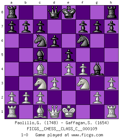 Last move : 1-0 2009 May 11 5:31:15 [Event "FICGS__CHESS__CLASS_C__000109"] [Site "FICGS"] [Date "2009.03.13"] [Round "1"] [White "Paolillo,Giampiero"] [Black "Gaffagan,Steven"] [Result "1-0"] [WhiteElo "1748"] [BlackElo "1654"] 1.e4 e5 2.Nc3 Bc5 3.Bc4 Nf6 4.f4 d6 5.Nf3 Nc6 6.d3 Bg4 7.h3 1-0 This chess game has been lost on time (started : 2009.03.13 20:27:19) Vienna game Player White won this chess game. Follow this game move after move (download)At this time Fischer is simply a level above all the best Chessplayers in the world. (John Jacobs) Kann Schach nicht schließlich das Nationalspiel der Deutschen werden? Und welche weiteren Ausblicke bieten sich dann dar! Welche Hebung des allgemeinen Kultur-Niveaus, ja der Moral, wenn das Schachbrett den Kartentisch verdrängen würde! Wahrlich, ein Ziel, des Schweißes der Edlen wert! (Siegbert Tarrasch) El Ajedrez era la lengua materna de Capablanca. (Reti) Le moment que je préfère le plus dans une rencontre, c'est celui où je sens que la personnalité de l'adversaire se brise. (Robert Fischer) The only difference between a tax man and a taxidermist is that the taxidermist leaves the skin. (Mark Twain)