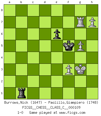 Last move : 1-0 2009 September 10 0:17:48 [Event "FICGS__CHESS__CLASS_C__000109"] [Site "FICGS"] [Date "2009.03.13"] [Round "1"] [White "Burrows,Nick"] [Black "Paolillo,Giampiero"] [Result "1-0"] [WhiteElo "1647"] [BlackElo "1748"] 1.e4 e5 2.Nf3 Nc6 3.Bb5 d6 4.d4 Bd7 5.Nc3 Nf6 6.O-O Be7 7.Re1 exd4 8.Nxd4 O-O 9.Bxc6 bxc6 10.Bf4 Rb8 11.b3 c5 12.Nf3 Be6 13.h3 Qd7 14.Qd3 c6 15.Rad1 Rbd8 16.Qa6 Rfe8 17.e5 Nd5 18.exd6 Bxd6 19.Bxd6 Nxc3 20.Rd3 Bf5 21.Rxc3 Rxe1+ 22.Nxe1 Re8 23.Nf3 Qxd6 24.Qxa7 Qd1+ 25.Kh2 Qd6+ 26.g3 Qh6 27.h4 Be6 28.Ng5 Qf6 29.Rf3 Qe7 30.Qxe7 Rxe7 31.Nxe6 fxe6 32.Rc3 Ra7 33.Rxc5 Rxa2 34.Rxc6 Kf7 35.g4 Ke7 36.Rc7+ Kf6 37.Kg3 h6 38.b4 Rb2 39.c3 g5 40.h5 Rb3 41.f3 Ke5 42.Rh7 Rxc3 43.Rxh6 Rb3 44.Rg6 Rxb4 45.h6 Rb8 46.Rxg5+ Kf6 47.Rg7 Rb1 48.g5+ Kf5 49.h7 1-0 Ruy Lopez : Old Steinitz defense Kingside Castling by player White (move 6) Kingside Castling by player Black (move 8) 10 pieces endgame at move 43 : White KRPPPP , Black KRPP WHITE : King + 1 Rook 4 Pawns BLACK : King + 1 Rook 2 Pawns 9 pieces endgame at move 44 : White KRPPP , Black KRPP WHITE : King + 1 Rook 3 Pawns BLACK : King + 1 Rook 2 Pawns 8 pieces endgame at move 46 : White KRPPP , Black KRP WHITE : King + 1 Rook 3 Pawns BLACK : King + 1 Rook 1 Pawn Player White won this chess game. Follow this game move after move (download)Examine moves that smite! A good eye for smites is far more important than a knowledge of strategical principles. (Purdy) Mein Gehirn das ist mein zweitwichtigstes Organ [Aus dem Film: Der Schläfer]. (Woody Allen) Cada Peón es potencialmente una Reina. (James Mason) Toutes les manuvres exécutées sur une colonne ouverte ont pour but ultime l'intrusion définitive sur la septième ou la huitième rangée, en plein cur de la position ennemie. (Aaron Nimzovitch) At last I discovered the true beauty of chess. So I proposed to her. (Dinesh De Silva)