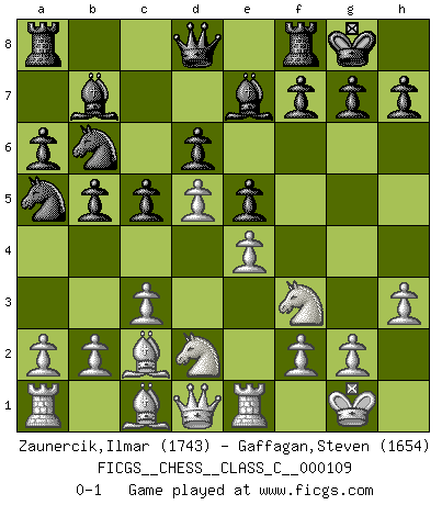 Last move : 0-1 2009 August 7 12:29:19 [Event "FICGS__CHESS__CLASS_C__000109"] [Site "FICGS"] [Date "2009.03.13"] [Round "1"] [White "Zaunercik,Ilmar"] [Black "Gaffagan,Steven"] [Result "0-1"] [WhiteElo "1743"] [BlackElo "1654"] 1.e4 e5 2.Nf3 Nc6 3.Bb5 a6 4.Ba4 Nf6 5.O-O Be7 6.Re1 b5 7.Bb3 d6 8.c3 O-O 9.h3 Na5 10.Bc2 c5 11.d4 Nd7 12.d5 Nb6 13.Nbd2 Bb7 0-1 Ruy Lopez : Closed Kingside Castling by player White (move 5) Kingside Castling by player Black (move 8) Player Black won this chess game. Follow this game move after move (download)I still hope to kill Fischer. (Boris Spassky) Im Spitzenschach von heute geht es nur um Vorbereitung, um tiefgründige, sorgfältige Eröffnungsvorbereitung. (Nigel Short) Los Peones son nacidos libres, y aún así, se encuentran por doquier encadenados. (Rick Kennedy) Un millionnaire : 'Monsieur Steinitz ! Vous ne participez aux tournois que pour l'argent, alors que moi je n'y viens que pour l'honneur.' Steinitz : 'Chacun joue pour ce qu'il n'a pas'... However beautiful the strategy, you should occasionally look at the results. (Winston Churchill)
