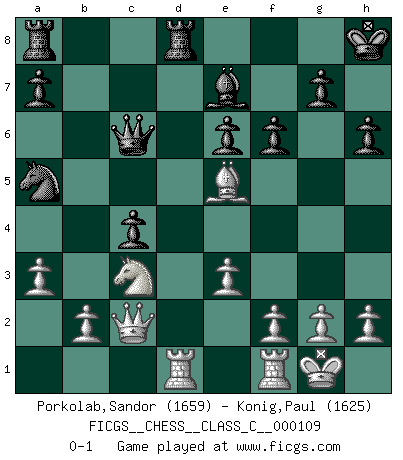 Last move : 0-1 2009 August 23 9:19:23 [Event "FICGS__CHESS__CLASS_C__000109"] [Site "FICGS"] [Date "2009.03.13"] [Round "1"] [White "Porkolab,Sandor"] [Black "Konig,Paul"] [Result "0-1"] [WhiteElo "1659"] [BlackElo "1625"] 1.Nf3 Nf6 2.d4 d5 3.c4 e6 4.Nc3 Be7 5.Bg5 h6 6.Bh4 O-O 7.e3 b6 8.Bd3 c5 9.dxc5 bxc5 10.cxd5 Nxd5 11.Bg3 Qb6 12.O-O Rd8 13.Ne5 Nc6 14.Nc4 Qb7 15.a3 Nb6 16.Qc2 Nxc4 17.Bxc4 Na5 18.Bd3 Bd7 19.Rad1 c4 20.Bh7+ Kh8 21.Be4 Bc6 22.Bxc6 Qxc6 23.Be5 f6 0-1 Reti Opening Kingside Castling by player Black (move 6) Kingside Castling by player White (move 12) Player Black won this chess game. Follow this game move after move (download)I like the moment when I break a man's ego. (Bobby Fischer) Jeder weiß, dass Gasprom Putins persönliches Machtinstrument ist. Die Firma wird vom Kreml aus geleitet und wird schon deshalb nie transparent sein. (Garry Kasparov) El Ajedrez, como cualquier otra actividad creativa, puede existir solo a través de méritos combinados de aquellos que tienen talento creativo y de aquellos que tienen la habilidad de organizar un trabajo creativo. (Mikhail Botvinnik) Les échecs sont plus proches de l'art de l'assassinat que de l'art de la guerre. (Arturo Perez-Reverte) Creativity is allowing yourself to make mistakes. Art is knowing which ones to keep. (Scott Adams)