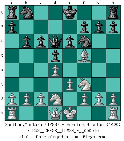 Last move : 1-0 2006 November 25 3:21:36 [Event "FICGS__CHESS__CLASS_F__000010"] [Site "FICGS"] [Date "2006.09.05"] [Round "1"] [White "Sarihan,Mustafa"] [Black "Bernier,Nicolas"] [Result "1-0"] [WhiteElo "1258"] [BlackElo "1400"] 1.Nf3 b6 2.d4 d5 3.Bf4 Nf6 4.Nbd2 Bf5 5.e3 e6 6.Bb5+ c6 7.Bd3 Bd6 8.Bxd6 Qxd6 9.Bxf5 1-0 This chess game has been lost on time (started : 2006.09.05 1:26:26) Reti Opening Player White won this chess game. Follow this game move after move (download)What is the difference between chess and football? Everybody understands football, but nobody plays it. Everybody plays chess, but nobody understands it. Everything is relative. (Vladimir Kramnik) Wenn Capablanka heute auf der Schachbühne erscheinen würde, hätte er ein halbes Jahr gebraucht um sich die Schachtheorie anzueignen. Und dann hätte er alles und jeden besiegt. (Mikhail Moiseyevich Botvinik) El Ajedrez es sobre todo, ¡una pelea!. (Emanuel Lasker) Aidez vos pièces, elles vous aideront. (Paul Morphy) Programmer - an organism that turns coffee into software. (Anonymous)