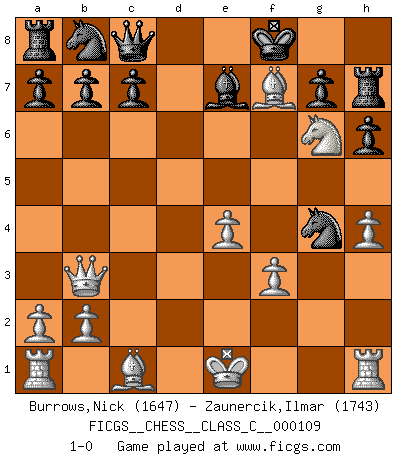 Last move : 1-0 2009 April 9 22:22:31 [Event "FICGS__CHESS__CLASS_C__000109"] [Site "FICGS"] [Date "2009.03.13"] [Round "1"] [White "Burrows,Nick"] [Black "Zaunercik,Ilmar"] [Result "1-0"] [WhiteElo "1647"] [BlackElo "1743"] 1.Nf3 d5 2.c4 Nf6 3.cxd5 Nxd5 4.e4 Nf6 5.Nc3 Bg4 6.Qb3 Qc8 7.d4 e6 8.Ne5 Be7 9.f3 Bh5 10.g4 Bg6 11.h4 h6 12.Nxg6 fxg6 13.Bc4 Kf7 14.d5 exd5 15.Nxd5 Kf8 16.Nf4 Rh7 17.Bf7 Nxg4 18.Nxg6+ 1-0 Reti Opening Player White won this chess game. Follow this game move after move (download)Look at Garry Kasparov. After he loses, invariably he wins the next game. He just kills the next guy. That's something that we have to learn to be able to do. (Maurice Ashley) Über Karpov: Er war und ist ein Vertreter der russischen Reaktionäre. Das steckt tief in seiner Seele, wehalb ich nicht nett mit ihm umgehen kann. (Viktor Kortschnoi) Por tratar de evitar la pérdida de una pieza, muchas personas han perdido una partida de Ajedrez. (Savielly Tartakover) Horreur, mais aussi harmonie suprême : qu'y avait-il en effet au monde en dehors des échecs ? Le brouillard, l'inconnu, le non-être... (Vladimir Nabokov) When the going gets tactical, the computers get going. (Hyatt)