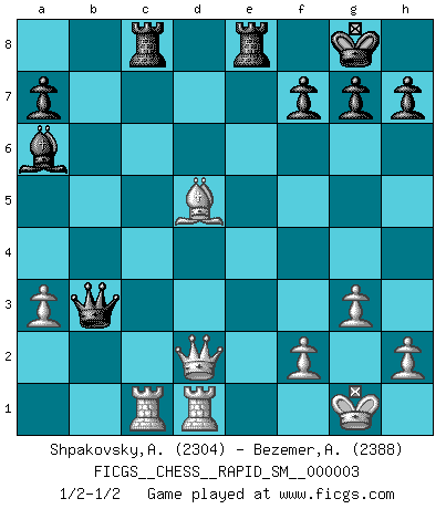 Last move : 1/2-1/2 2009 March 20 16:29:14 [Event "FICGS__CHESS__RAPID_SM__000003"] [Site "FICGS"] [Date "2009.03.14"] [Round "1"] [White "Shpakovsky,Alexander"] [Black "Bezemer,Arno"] [Result "1/2-1/2"] [WhiteElo "2304"] [BlackElo "2388"] 1.d4 Nf6 2.c4 e6 3.Nf3 b6 4.g3 Ba6 5.b3 b5 6.cxb5 Bxb5 7.Bg2 d5 8.O-O Nbd7 9.Nc3 Ba6 10.Ne5 c6 11.Nd3 Rc8 12.Bb2 Be7 13.Rc1 O-O 14.Na4 Re8 15.Qd2 Bb5 16.Nc3 Ba6 17.Rfd1 c5 18.dxc5 Nxc5 19.Nxc5 Rxc5 20.Ba3 Rc8 21.Bxe7 Qxe7 22.e4 Qb4 23.exd5 Nxd5 24.a3 Qxb3 25.Nxd5 exd5 26.Bxd5 1/2-1/2 Queen's Indian : Nimzovich variation (exaggerated Fianchetto) Kingside Castling by player White (move 8) Kingside Castling by player Black (move 13) This chess game ended in a draw. Follow this game move after move (download)It's just you and your opponent at the board and you're trying to prove something. (Bobby Fischer) Ich spiele ehrlich und spiele, um zu gewinnen. Wenn ich verliere nehme ich meine Medizin. (Robert James Fischer) El Ajedrez detiene a su maestro dentro de sus propios vínculos, encadenando la mente y el cerebro, por lo que la libertad interior del mas fuerte debe sufrir. (Albert Einstein) Des idées, des idées, j'en ai cent, j'en ai mille. Des bonnes, des mauvaises, applicables, irréalisables... Il suffit de faire le tri ! (Roos) Knowledge will give you power, but character respect. (Bruce Lee)