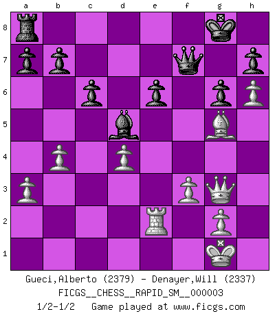 Last move : 1/2-1/2 2009 July 13 7:5:18 [Event "FICGS__CHESS__RAPID_SM__000003"] [Site "FICGS"] [Date "2009.04.05"] [Round "1"] [White "Gueci,Alberto"] [Black "Denayer,Will"] [Result "1/2-1/2"] [WhiteElo "2379"] [BlackElo "2337"] 1.e4 e5 2.Nf3 d6 3.d4 exd4 4.Nxd4 Nf6 5.Nc3 Be7 6.Bf4 O-O 7.Qd2 c6 8.Be2 d5 9.exd5 Nxd5 10.Nxd5 Qxd5 11.Bf3 Qc4 12.b3 Qa6 13.Be2 Qb6 14.O-O Bf6 15.c3 Nd7 16.Rfe1 Rd8 17.Qe3 Nf8 18.Qg3 Bxd4 19.cxd4 Re8 20.h4 Bf5 21.Rad1 Bc2 22.Rd2 Qa5 23.a3 Be4 24.b4 Qd8 25.Bg4 Bd5 26.Rxe8 Qxe8 27.Re2 Ne6 28.h5 Qd8 29.h6 g6 30.Bxe6 fxe6 31.f3 Qf8 32.Bg5 Qf7 1/2-1/2 Philidor : Exchange variation Kingside Castling by player Black (move 6) Kingside Castling by player White (move 14) This chess game ended in a draw. Follow this game move after move (download)I play correspondence chess because it is both art and science while chess is art only. (A player at FICGS) Wenn ich einen Club besuche, sind die Spieler stumm vor Staunen. (José Raúl Capablanca) Vive, pierde y aprende al observar a tu oponente como ganar. (Amber Steenbock) D'abord les bases : Jouez et étudiez, puis étudiez et jouez, ensuite jouez et étudiez, puis étudiez et jouez. Deuxièmement : Donnez toujours le meilleur de vous-même ! (Ken Smith) Don't be irreplaceable, if you can't be replaced, you can't be promoted. (Dan Rotaru)