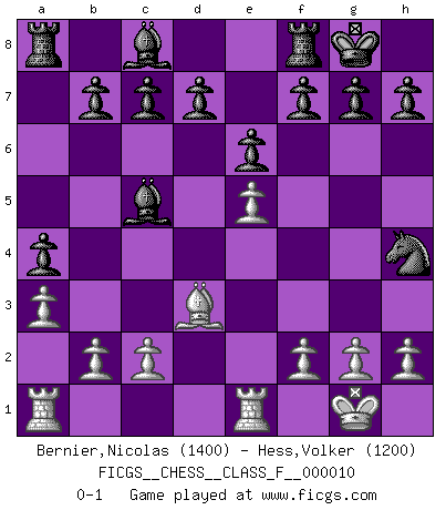 Last move : 0-1 2006 October 17 16:40:50 [Event "FICGS__CHESS__CLASS_F__000010"] [Site "FICGS"] [Date "2006.09.05"] [Round "1"] [White "Bernier,Nicolas"] [Black "Hess,Volker"] [Result "0-1"] [WhiteElo "1400"] [BlackElo "1200"] 1.d4 e6 2.e4 Nf6 3.Bg5 Be7 4.e5 Ne4 5.Nf3 Nxg5 6.Bd3 Nxf3+ 7.Qxf3 O-O 8.Nd2 Nc6 9.Nb3 a5 10.O-O a4 11.Nc5 Nxd4 12.Qe4 Nf5 13.a3 Bxc5 14.Rfe1 Qh4 15.Qxh4 Nxh4 0-1 Queen's pawn Kingside Castling by player Black (move 7) Kingside Castling by player White (move 10) Player Black won this chess game. Follow this game move after move (download)Suddenly it was obvious to me in my analysis I had missed what Fischer had found with the greatest of ease at the board. (Mikhail Botvinnik) Die unerbitterlichsten Regeln im Schach sind die Ausnahmen. (Savielly Grigorievitsch Tartakower) El Ajedrez es 99 por ciento táctica. (Teichmann) Vous n'êtes pas toujours obligé de jouer le meilleur coup. Un coup doit être actif, entreprenant, correct et beau ! (David Bronstein) When you've done things right people won't know you've done anything at all. (Futurama)