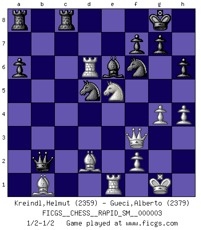 Last move : 1/2-1/2 2009 July 12 22:29:23 [Event "FICGS__CHESS__RAPID_SM__000003"] [Site "FICGS"] [Date "2009.03.14"] [Round "1"] [White "Kreindl,Helmut"] [Black "Gueci,Alberto"] [Result "1/2-1/2"] [WhiteElo "2359"] [BlackElo "2379"] 1.d4 d5 2.c4 c6 3.Nf3 Nf6 4.e3 e6 5.Bd3 Nbd7 6.O-O Bd6 7.Nbd2 O-O 8.e4 e5 9.cxd5 cxd5 10.Re1 Qc7 11.exd5 exd4 12.Nc4 Nb6 13.Nxd6 Qxd6 14.Nxd4 Nbxd5 15.h3 Rd8 16.Nb5 Qb6 17.Bd2 a6 18.Na3 Be6 19.Nc4 Qb5 20.Ne5 Qxb2 21.Rb1 Qxa2 22.Rxb7 Rdc8 23.Bb1 Qa3 24.Rb3 Qa4 25.Qf3 Qd4 26.Rd3 Qb2 27.g4 h6 28.h4 Nb4 29.Rd6 Nbd5 1/2-1/2 QGD Slav : 4.e3 Kingside Castling by player White (move 6) Kingside Castling by player Black (move 7) This chess game ended in a draw. Follow this game move after move (download)The Pin is mightier than the sword. (Fred Reinfeld) Ich tröste mich mit dem Vergnügen, daß Schachfans, Zuschauer und Leser glücklich sind, wenn ein Großmeister etwas riskiert, statt nur Klötzchen zu schieben. (Mikhail Nekhemyevich Tal) Un jugador que trata de regresar una movida en el Ajedrez es un futuro carterista. (Richard Fenton) Le pion, dans sa simplicité, marche droit devant lui, mais lorsqu'il prend, il le fait obliquement? Ainsi l'homme, tant qu'il reste pauvre, marche dans la droiture et vit honnêtement, mais lorsqu'il recherche les honneurs, il flatte, se parjure et, par les voies obliques, cherche une position supérieure sur l'échiquier du monde. (Jean de Galles) You know what they say : You lie down with the Devil, you wake up in Hell. (Horatio Caine, C.S.I. Miami)