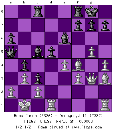 Last move : 1/2-1/2 2009 August 2 23:44:5 [Event "FICGS__CHESS__RAPID_SM__000003"] [Site "FICGS"] [Date "2009.04.05"] [Round "1"] [White "Repa,Jason"] [Black "Denayer,Will"] [Result "1/2-1/2"] [WhiteElo "2336"] [BlackElo "2337"] 1.e4 e5 2.Nf3 d6 3.d4 exd4 4.Nxd4 Be7 5.Nc3 Nf6 6.Bf4 O-O 7.Qd2 Nc6 8.O-O-O Nxd4 9.Qxd4 a6 10.f3 b5 11.g4 c5 12.Qf2 b4 13.Ne2 Be6 14.Kb1 Qa5 15.Nc1 c4 16.g5 Nd7 17.h4 Rac8 18.Bh3 c3 19.b3 Nc5 20.Nd3 d5 21.Nxc5 Bxc5 22.Qg3 1/2-1/2 Philidor : Exchange variation Kingside Castling by player Black (move 6) Queenside Castling by player White (move 8) This chess game ended in a draw. Follow this game move after move (download)Pawn endings are to Chess what putting is to golf. (Cecil Purdy) Sicherlich können nur Meister einen Stil haben. Daß ein nicht-Meister auch nur ein einziges Mal in seinem Leben eine Partie folgerecht durchführte, habe ich niemals bemerkt. (Emanuel Lasker) Un entendimiento a fondo de las continuaciones típicas del mate, hace de las combinaciones de sacrificio mas complicadas conducirlas a ellas no solo sin dificultad, sino casi de una manera natural. (Siegbert Tarrasch) Il (Jacob Murray) ne joue pas pour le bon coup, mais pour le meilleur. (Eloi Relange) We need strong personalities and only one world champion to attract sponsors. (Anatoly Karpov)