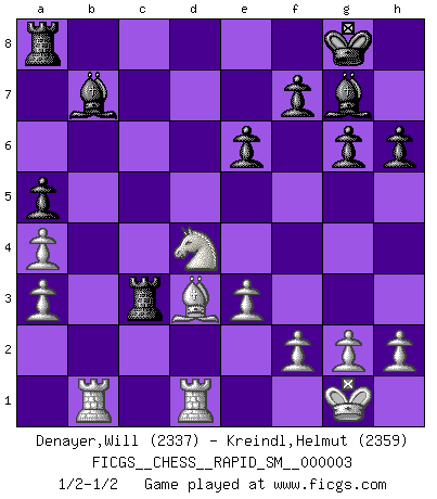 Last move : 1/2-1/2 2009 July 12 9:50:19 [Event "FICGS__CHESS__RAPID_SM__000003"] [Site "FICGS"] [Date "2009.04.05"] [Round "1"] [White "Denayer,Will"] [Black "Kreindl,Helmut"] [Result "1/2-1/2"] [WhiteElo "2337"] [BlackElo "2359"] 1.Nf3 d5 2.d4 Nf6 3.c4 e6 4.Nc3 c6 5.Bg5 h6 6.Bxf6 Qxf6 7.e3 Nd7 8.Bd3 dxc4 9.Bxc4 g6 10.O-O Bg7 11.Qc2 Qe7 12.Rad1 O-O 13.Rfe1 b5 14.Bd3 Bb7 15.Nd2 Rfc8 16.Nb3 a5 17.a4 Qb4 18.Ra1 c5 19.Bxb5 cxd4 20.Nxd4 Nb6 21.Red1 Nc4 22.Rab1 Na3 23.bxa3 Qxc3 24.Qxc3 Rxc3 25.Bd3 1/2-1/2 Reti Opening Kingside Castling by player White (move 10) Kingside Castling by player Black (move 12) This chess game ended in a draw. Follow this game move after move (download)Chess makes man wiser and clear-sighted. (Vladimir Putin) Die starken Figuren des Gegners muss man abtauschen. (José Raúl Capablanca) Robert Fischer es la ley hacia si mismo. (Larry Evans) Si rien de grave n'est détecté lors de l'analyse d'une position, on joue alors le coup. Seconde règle de Blumenfeld. It is a good thing for an uneducated man to read books of quotations. (Winston Churchill)
