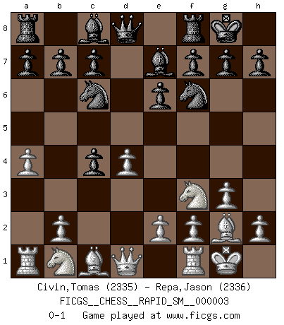 Last move : 0-1 2009 May 7 5:14:54 [Event "FICGS__CHESS__RAPID_SM__000003"] [Site "FICGS"] [Date "2009.03.14"] [Round "1"] [White "Civin,Tomas"] [Black "Repa,Jason"] [Result "0-1"] [WhiteElo "2335"] [BlackElo "2336"] 1.d4 e6 2.c4 Nf6 3.g3 d5 4.Nf3 Be7 5.Bg2 O-O 6.O-O dxc4 7.a4 Nc6 0-1 This chess game has been lost on time (started : 2009.03.14 11:3:42) Queen's pawn Kingside Castling by player Black (move 5) Kingside Castling by player White (move 6) Player Black won this chess game. Follow this game move after move (download)I have never in my life played the French Defence, which is the dullest of all openings. (Wilhelm Steinitz) Vom Schach wurde gesagt das Leben sei dafür nicht lange genug. Aber das ist der Fehler des Lebens, nicht des Schach'. (Irving Chernev) Alekhine es un poeta que crea un trabajo de arte de algo que raramente inspiraría a otra persona a mandar una tarjeta postal. (Max Euwe) Nous sommes les pions de la mystérieuse partie d'Echecs jouée par Dieu. Il nous déplace, nous arrête, nous pousse encore, puis nous lance un à un dans la boîte du Néant. Epitaphe sur la tombe de David Janowsky (1868-1927). Without deviation from the norm, progress is not possible. (Frank Zappa)
