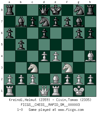 Last move : 1-0 2009 May 6 5:8:45 [Event "FICGS__CHESS__RAPID_SM__000003"] [Site "FICGS"] [Date "2009.03.14"] [Round "1"] [White "Kreindl,Helmut"] [Black "Civin,Tomas"] [Result "1-0"] [WhiteElo "2359"] [BlackElo "2335"] 1.d4 g6 2.e4 Bg7 3.Nc3 d6 4.Nf3 a6 5.Be2 b5 6.O-O Bb7 7.Re1 Nd7 8.Bg5 h6 9.Bh4 1-0 This chess game has been lost on time (started : 2009.03.14 11:3:42) Modern defense Kingside Castling by player White (move 6) Player White won this chess game. Follow this game move after move (download)When asked, -How is that you pick better moves than your opponents?, I responded: I'm very glad you asked me that, because, as it happens, there is a very simple answer. I think up my own moves, and I make my opponent think up his. (Alexander Alekhine) Es ist schade, dass viele Schachsportler vergessen, wie wichtig Auftreten und angemessene Kleidung sind. (Alexandra Kosteniuk) Coloca el contenido del tablero de Ajedrez en un sombrero, agita las piezas vigorosamente, derrámalas en el tablero desde una altura de medio metro y asà obtienes el estilo de Wilhelm Steinitz. (H. E. Bird) On a dit que l'homme se distingue de l'animal par le fait qu'il achète plus de livres qu'il ne peut en lire. Je voudrais suggérer qu'inclure à la liste des livres quelques livres d'échecs rendrait la distinction manifeste. (Edward Lasker) Empty your mind, be formless, shapeless — like water. (Bruce Lee)