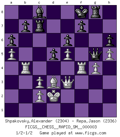 Last move : 1/2-1/2 2009 July 11 20:27:27 [Event "FICGS__CHESS__RAPID_SM__000003"] [Site "FICGS"] [Date "2009.03.14"] [Round "1"] [White "Shpakovsky,Alexander"] [Black "Repa,Jason"] [Result "1/2-1/2"] [WhiteElo "2304"] [BlackElo "2336"] 1.e4 e6 2.d4 d5 3.Nc3 Nf6 4.Bg5 Bb4 5.e5 h6 6.Bd2 Bxc3 7.bxc3 Ne4 8.Qg4 g6 9.Bd3 Nxd2 10.Kxd2 c5 11.h4 Qa5 12.Nf3 Nc6 13.Qf4 cxd4 14.Nxd4 Nxd4 15.Qxd4 Bd7 16.h5 g5 17.Rhb1 Bc6 18.a4 Rc8 19.g4 Rg8 20.Rb4 Qc7 21.a5 a6 22.Rb6 Kf8 23.Rf1 Qe7 24.Rb4 Rc7 25.Qe3 Qd8 26.f4 gxf4 27.Rbxf4 Qg5 28.Rb1 Bd7 29.R1b4 Bc8 1/2-1/2 French : MacCutcheon, Lasker variation This chess game ended in a draw. Follow this game move after move (download)The isolated Pawn casts gloom over the entire chessboard. (Aaron Nimzovich) Es gibt nur zwei wahre Schachgenies - das andere war Wilhelm Steinitz, der Weltmeister von 1872 bis 1894. (Robert James Fischer) El ganar no lo es todo... pero el perder es nada. (Mednis) Il n'y a pas eu de défaite parce que je ne crois pas que cet ordinateur ait jamais existé. IBM a triché en refusant d'imprimer les modes de recherche de la machine. C'est évident, pendant le match, des coups décisifs ont été joués par des êtres humains. Aujourd'hui, les meilleurs spécialistes en informatique ne peuvent toujours pas expliquer comment Deep-Blue a pu jouer contre la logique des ordinateurs. IBM a gagné une guerre de communication, mais ils sont incapables de prouver que l'ordinateur a gagné tout seul. (Garry Kasparov) Bobby never cared about money, though. His only desire was to prove that his choices were correct: He wanted chess to be important because he was a chess player, and he wanted to be important. Bobby knew money was important, but he didn't have a clue why, outside of clothes and status. The only way he could accomplish what he wanted was to fight for a lot of money. Once he got it, he gave it away. He did not know how to spend it. And once he'd become champion, after, essentially, sacrificing his life for it, he didn't know how to spend his time. (Bob Wade)