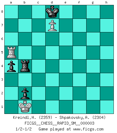 Last move : 1/2-1/2 2009 July 11 5:22:5 [Event "FICGS__CHESS__RAPID_SM__000003"] [Site "FICGS"] [Date "2009.03.14"] [Round "1"] [White "Kreindl,Helmut"] [Black "Shpakovsky,Alexander"] [Result "1/2-1/2"] [WhiteElo "2359"] [BlackElo "2304"] 1.d4 d5 2.c4 c6 3.Nf3 Nf6 4.e3 Bf5 5.Nc3 e6 6.Nh4 Be4 7.f3 Bg6 8.Qb3 Qc7 9.Bd2 Nbd7 10.cxd5 Nxd5 11.e4 Nxc3 12.bxc3 Bh5 13.g3 Be7 14.Be2 Bxh4 15.gxh4 O-O 16.O-O Kh8 17.Kh1 e5 18.Rg1 f5 19.Rg5 Bf7 20.Qc2 fxe4 21.fxe4 Nf6 22.Bf3 exd4 23.cxd4 Bg6 24.Re1 Rad8 25.Bc3 Rde8 26.Bb4 Qf4 27.Qg2 Nxe4 28.Rxg6 Qxf3 29.Qxf3 Rxf3 30.Rg4 Nf6 31.Rxe8+ Nxe8 32.Re4 Nf6 33.Re7 Rf5 34.a4 a5 35.Bd6 Rf1+ 36.Kg2 Rb1 37.Be5 Kg8 38.Kf3 Rb4 39.Bxf6 gxf6 40.Ke3 h5 41.Kd3 Kf8 42.Rh7 Ke8 43.Rxh5 Rxa4 44.Rh7 b5 45.h5 Ra2 46.Rc7 Rxh2 47.Rxc6 Rxh5 48.Rxf6 a4 49.Kc3 Rh3+ 50.Kc2 b4 51.Rb6 Rc3+ 52.Kd2 Rb3 53.Kc2 Kd7 54.d5 Rc3+ 55.Kb2 Rc4 56.Ra6 b3 57.Ka3 Rb4 58.Kb2 Kc7 59.d6+ Kb7 60.d7 Kc7 61.Ra7+ Kd8 62.Kb1 b2 63.Ra5 1/2-1/2 QGD Slav : 4.e3 Bf5 Kingside Castling by player Black (move 15) Kingside Castling by player White (move 16) 10 pieces endgame at move 46 : White KRPP , Black KRPPPP WHITE : King + 1 Rook 2 Pawns BLACK : King + 1 Rook 4 Pawns 9 pieces endgame at move 47 : White KRPP , Black KRPPP WHITE : King + 1 Rook 2 Pawns BLACK : King + 1 Rook 3 Pawns 8 pieces endgame at move 47 : White KRP , Black KRPPP WHITE : King + 1 Rook 1 Pawn BLACK : King + 1 Rook 3 Pawns 7 pieces endgame at move 48 : White KRP , Black KRPP WHITE : King + 1 Rook 1 Pawn BLACK : King + 1 Rook 2 Pawns This chess game ended in a draw. Follow this game move after move (download)Chess makes man wiser and clear-sighted. (Vladimir Putin) Ich verachte Kasparow. (Viktor Kortschnoi) El Ajedrez detiene a su maestro dentro de sus propios vínculos, encadenando la mente y el cerebro, por lo que la libertad interior del mas fuerte debe sufrir. (Albert Einstein) Mon pion favori sur ma case favorite ! Bronstein en parlant d'un coup de pion en h5 quand il avait les Noirs. When I took office, only high energy physicists had ever heard of what is called the World Wide Web... Now even my cat has its own page. (Bill Clinton, 1996)