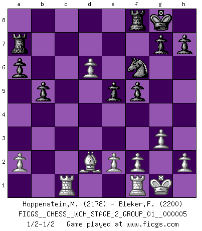 Last move : 1/2-1/2 2009 April 8 21:58:40 [Event "FICGS__CHESS__WCH_STAGE_2_GROUP_01__000005"] [Site "FICGS"] [Date "2009.03.18"] [Round "1"] [White "Hoppenstein,Michael"] [Black "Bleker,Frits"] [Result "1/2-1/2"] [WhiteElo "2178"] [BlackElo "2200"] 1.d4 Nf6 2.c4 e6 3.Nc3 Bb4 4.Nf3 c5 5.g3 cxd4 6.Nxd4 O-O 7.Bg2 d5 8.Qb3 Bxc3+ 9.bxc3 e5 10.Nb5 dxc4 11.Qxc4 a6 12.Nc7 Ra7 13.Nd5 Nxd5 14.Qxd5 Qxd5 15.Bxd5 b5 16.c4 Bb7 17.O-O Bxd5 18.cxd5 Nd7 19.Bd2 f5 20.Rac1 Nf6 21.d6 1/2-1/2 Nimzo-Indian : Three knights variation Kingside Castling by player Black (move 6) Kingside Castling by player White (move 17) This chess game ended in a draw. Follow this game move after move (download)A Chess game is divided into three stages: the first, when you hope you have the advantage, the second when you believe you have an advantage, and the third... when you know you're going to lose ! (Savielly Tartakower) Mit Schach schule ich mein Gefühl für Geometrie, was für Tennis und Schach gleichermaßen wichtig ist. (Boris Becker) Nos gusta pensar. (Gary Kasparov) L'attaque fait le spectacle, la défense gagne les matchs. (Dicton footballistique) Luck never gives; it only lends. (Swedish proverb)
