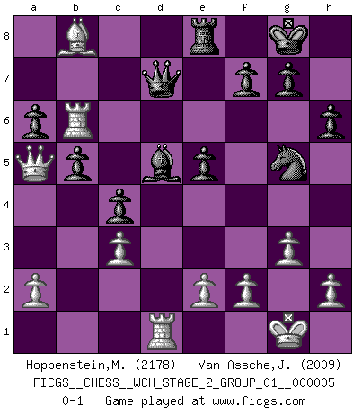 Last move : 0-1 2009 April 12 13:59:46 [Event "FICGS__CHESS__WCH_STAGE_2_GROUP_01__000005"] [Site "FICGS"] [Date "2009.03.18"] [Round "1"] [White "Hoppenstein,Michael"] [Black "Van Assche,Jeroen"] [Result "0-1"] [WhiteElo "2178"] [BlackElo "2009"] 1.d4 Nf6 2.c4 e6 3.Nc3 Bb4 4.Nf3 c5 5.g3 cxd4 6.Nxd4 O-O 7.Bg2 d5 8.O-O dxc4 9.Qa4 Na6 10.Ndb5 Nd5 11.Rd1 Bxc3 12.Nxc3 Nxc3 13.bxc3 Nc5 14.Qc2 Qc7 15.Ba3 Rb8 16.Rd4 b5 17.Qb2 Re8 18.Rad1 a6 19.Qb4 e5 20.Rd6 Ne6 21.Rc6 Qa7 22.Qa5 h6 23.Bd6 Qd7 24.Bd5 Bb7 25.Rb6 Ng5 26.Bxb8 Bxd5 0-1 Nimzo-Indian : Three knights variation Kingside Castling by player Black (move 6) Kingside Castling by player White (move 8) Player Black won this chess game. Follow this game move after move (download)Chess is not like life... it has rules ! (Mark Pasternak) Ohne ihre Erfolge schmälern zu wollen würde ich sagen Petrosian, Spassky und Karpov verdanken ihre Siege ihren Trainern - Boleslavsky, Bondarevsky und Furman. (Mikhail Moiseyevich Botvinik) El hombre es un frívolo, una creatura engañosa y como un jugador de Ajedrez, se preocupa mas por el proceso de obtener su meta que de la meta por sí misma. (Dostoyevsky) Des idées, des idées, j'en ai cent, j'en ai mille. Des bonnes, des mauvaises, applicables, irréalisables... Il suffit de faire le tri ! (Roos) A mistake is only a mistake if you let it happen twice. Otherwise it is a learning experience. (Daniel Parmet)