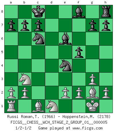 Last move : 1/2-1/2 2009 April 4 11:15:31 [Event "FICGS__CHESS__WCH_STAGE_2_GROUP_01__000005"] [Site "FICGS"] [Date "2009.03.18"] [Round "1"] [White "Russi Roman,Tano-Urayoan"] [Black "Hoppenstein,Michael"] [Result "1/2-1/2"] [WhiteElo "1966"] [BlackElo "2178"] 1.c4 f5 2.g3 Nf6 3.Bg2 e5 4.Nf3 e4 5.Nd4 d5 6.cxd5 Qxd5 7.Nb3 Be6 8.O-O Nc6 9.d3 O-O-O 10.Nc3 Qd7 11.dxe4 Qxd1 12.Rxd1 Rxd1+ 13.Nxd1 Nxe4 1/2-1/2 English : Anglo-Dutch defense Kingside Castling by player White (move 8) Queenside Castling by player Black (move 9) This chess game ended in a draw. Follow this game move after move (download)If a ruler does not understand Chess, how can he rule over a kingdom ? (King Khusros II) Ein Remis kann durch Wiederholung von drei Zügen oder durch einen schlechte Zug erreicht werden. (Savielly Grigorievitsch Tartakower) En la perfecta combinación de Ajedrez como en una historia corta de primera clase, toda la trama y contra trama deberá conducir hacia un final sorprendente, el interes no es mitigado hasta el último momento. (Yates and Winter) D'abord les bases : Jouez et étudiez, puis étudiez et jouez, ensuite jouez et étudiez, puis étudiez et jouez. Deuxièmement : Donnez toujours le meilleur de vous-même ! (Ken Smith) The bottom line is always the bottom line. (Johann Piek)