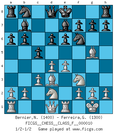 Last move : 1/2-1/2 2006 October 17 0:43:0 [Event "FICGS__CHESS__CLASS_F__000010"] [Site "FICGS"] [Date "2006.09.05"] [Round "1"] [White "Bernier,Nicolas"] [Black "Ferreira,Getulio"] [Result "1/2-1/2"] [WhiteElo "1400"] [BlackElo "1300"] 1.e4 c5 2.Nf3 d6 3.c3 e6 4.d4 b6 5.Bd3 Nf6 6.O-O Be7 7.Re1 a6 8.Bg5 Bb7 9.Nbd2 1/2-1/2 Sicilian Kingside Castling by player White (move 6) This chess game ended in a draw. Follow this game move after move (download)Whoever sees no other aim in the game than that of giving checkmate to one's opponent will never become a good Chess player. (Euwe) Ein Springer auf f6 gegen die eigene Rochadestellung ist schlimmer als ein rostiger Nagel im Knie. (Efim Bogoljubov) Creo que una cierta cantidad de temperamento es esperada de los genios del Ajedrez. (Ron Gross) Vous m'avez demandé de vous exposer quel est le fondement de la prière. Je ne fais que préparer les pièces du jeu sur la table... Nous sera-t-il permis d'en adopter les règles et si nous les appliquons scrupuleusement nous ne tarderons pas à faire mat le Roi divin ! Il ne pourra échapper à nos mains. (Sainte Thérèse d'Avila, Chemin de perfection) Always remember that you are unique; just like everyone else. (Unknown)