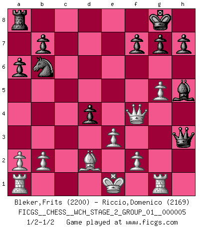 Last move : 1/2-1/2 2009 May 22 10:53:55 [Event "FICGS__CHESS__WCH_STAGE_2_GROUP_01__000005"] [Site "FICGS"] [Date "2009.03.15"] [Round "1"] [White "Bleker,Frits"] [Black "Riccio,Domenico"] [Result "1/2-1/2"] [WhiteElo "2200"] [BlackElo "2169"] 1.d4 d5 2.c4 c6 3.Nf3 Nf6 4.Nc3 e6 5.e3 Nbd7 6.Qc2 Bd6 7.g4 dxc4 8.Bxc4 e5 9.g5 Nd5 10.Bd2 N7b6 11.Bxd5 cxd5 12.dxe5 Bg4 13.exd6 Bxf3 14.Rg1 O-O 15.Qf5 Bh5 16.Nb5 a6 17.Nc7 Qxd6 18.Nxa8 Qxh2 19.Kf1 Rxa8 20.Qf4 Qh3+ 21.Ke1 d4 1/2-1/2 QGD Slav : 4.Nc3 Kingside Castling by player Black (move 14) This chess game ended in a draw. Follow this game move after move (download)If one piece is badly posted, the whole game is bad. (Tarrasch) Frage: Gibt es etwas was Sie mehr lieben als Autobahnen ohne Tempobegrenzungen? - Antwort: Deutsche Frauen ohne Tempobegrenzungen. (Loek van Wely) Bobby Fischer es el mas grande genio de Ajedrez de todos los tiempos. (Alexander Kotov) C'est la seule position que je connaisse où les deux camps sont mals. Propos prêtés à V. Anand. The best teachers teach from the heart, not from the book. (Author unknown)