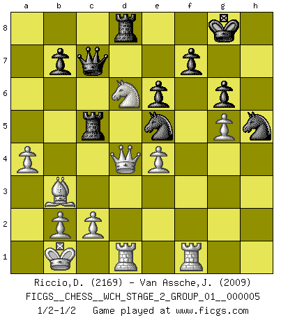 Last move : 1/2-1/2 2009 June 6 21:2:5 [Event "FICGS__CHESS__WCH_STAGE_2_GROUP_01__000005"] [Site "FICGS"] [Date "2009.03.15"] [Round "1"] [White "Riccio,Domenico"] [Black "Van Assche,Jeroen"] [Result "1/2-1/2"] [WhiteElo "2169"] [BlackElo "2009"] 1.e4 c5 2.Nf3 d6 3.d4 cxd4 4.Nxd4 Nf6 5.Nc3 g6 6.Be3 Bg7 7.f3 Nc6 8.Qd2 O-O 9.Bc4 Bd7 10.O-O-O Rc8 11.Bb3 Ne5 12.Kb1 Re8 13.h4 h5 14.g4 hxg4 15.h5 Nxh5 16.Bh6 e6 17.Rdg1 Qf6 18.fxg4 Bxh6 19.Qxh6 Qg7 20.Qe3 Nf6 21.g5 Nh5 22.Ndb5 Qf8 23.Rd1 Bxb5 24.Nxb5 Red8 25.Qxa7 Qe7 26.Qe3 Rc5 27.a4 Ng4 28.Qd4 Ne5 29.Nxd6 Qc7 30.Rhf1 1/2-1/2 Sicilian : Dragon, Yugoslav attack Kingside Castling by player Black (move 8) Queenside Castling by player White (move 10) This chess game ended in a draw. Follow this game move after move (download)Chess is a matter of delicate judgment, knowing when to punch and how to duck. (Bobby Fischer) Mein erstes Ziel war nicht, die Partie zu gewinnen, sondern eine Figur zu opfern. -- der junge (Wilhelm Steinitz) No hay otro maestro que tenga una voluntad terrífica de ganar. Al tablero, el irradía peligro y aún los oponentes mas fuertes tienden a congelarse como liebres cuando olfatean a una pantera. Aún sus debilidades son peligrosas. Con las blancas, su juego de apertura es predecible - te es posible hacer planes en su contra - pero es tan fuerte que tus planes casi nunca funcionan. En el juego medio, su precisión e invención son fabulosas y en finales, tú simplemente no le puedes vencer. (Experto Alemán anónimo) Je menace de comprendre la position. (Anonyme) The ultimate in disposing one's troops is to be without ascertainable shape. Then the most penetrating spies cannot pry in nor can the wise lay plans against you. (Sun Tzu)