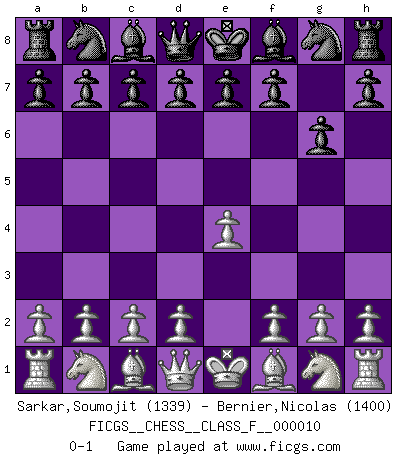 Last move : 0-1 2006 October 18 12:35:36 [Event "FICGS__CHESS__CLASS_F__000010"] [Site "FICGS"] [Date "2006.09.05"] [Round "1"] [White "Sarkar,Soumojit"] [Black "Bernier,Nicolas"] [Result "0-1"] [WhiteElo "1339"] [BlackElo "1400"] 1.e4 g6 0-1 This chess game has been lost on time (started : 2006.09.05 1:26:26) Robatsch (Modern) defense Player Black won this chess game. Follow this game move after move (download)Chess is a terrible game. If you have no center, your opponent has a freer position. If you do have a center, then you really have something to worry about ! (Siegbert Tarrasch) Modernes Schach erfordert enorme Anspannung. Es ist für einen normalen Menschen unmöglich das auszuhalten. (Viktor Kortschnoi) El Ajedrez es la vida. (Bobby Fischer) Aux échecs, les retours au sommet sont rares : les dommages psychologiques consécutifs à une défaite sont trop sévères. (Daily Telegraph) As a goal marker shodan is important. As a destination it is a poor place to stop. (Thomas Tamayo)